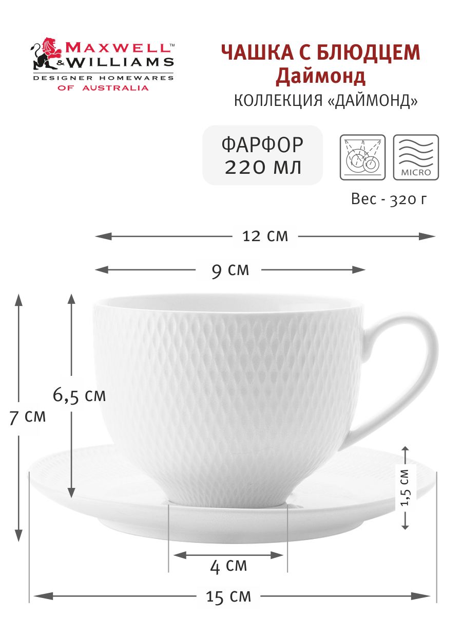 Чайный набор на 4 персоны Maxwell & Williams даймонд, сервиз 8 предметов: 4 шт чашки 220 мл и блюдца из фарфора, подарочный
