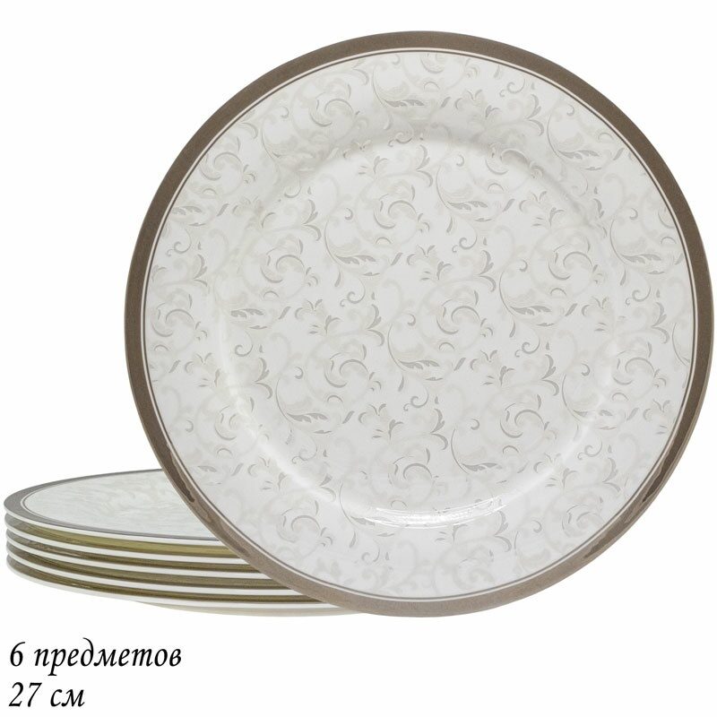 Шт набор из 6 тарелок 27см. в под.уп.серый шелк. Коллекция СЕРЫЙ ШЕЛК изготовлена из легкого костяного фарфора. Декор выполнен в виде полупрозрачных с перламутровыми элементами цветах, часть элементов видна при определённом освещении. Серебряная окантовка подчеркивает нежность перламутровых элементов. Коллекция состоит предметов сервировки, чайных и кофейных сервизов Упаковано в подарочную коробку Материал: костяной фарфор Не рекомендуется использовать в микроволновой печи и мыть в посудомоечной машине, по причине возможного повреждения серебряного декоративного покрытия.