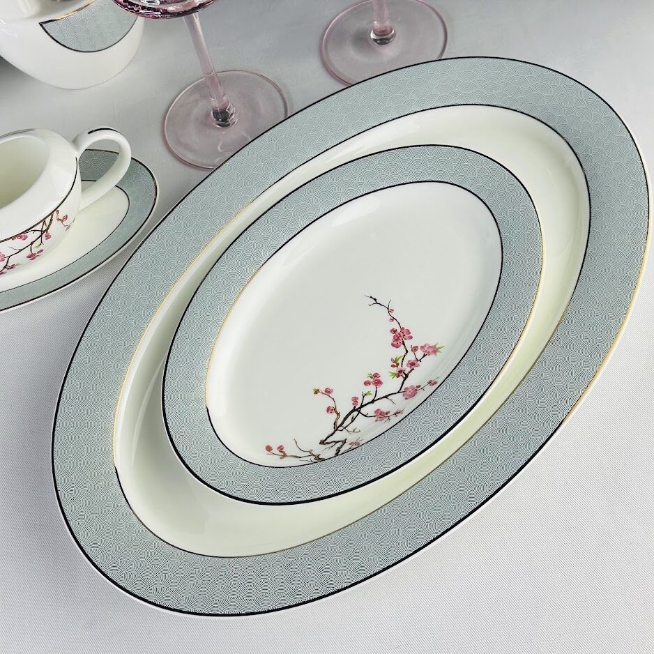 Овальное блюдо 23см сакурауп. костяной фарфор. Коллекция САКУРА выполнена из воздушного костяного фарфора. Орнамент на бортах в рельефном исполнении, сочетает модный серый цвет с белой паутинкой. Нежная розовая ветка сакуры оттеняет рисунок борта, отводка золотом. Коллекция состоит предметов сервировки, чайных и кофейных сервизов Упаковано в подарочную коробку Материал: костяной фарфор Не рекомендуется использовать в микроволновой печи и мыть в посудомоечной машине, по причине возможного повреждения золотого декоративного покрытия.