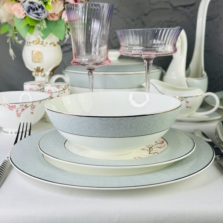 Коллекция САКУРА выполнена из воздушного костяного фарфора. Орнамент на бортах в рельефном исполнении, сочетает модный серый цвет с белой паутинкой. Нежная розовая ветка сакуры оттеняет рисунок борта, отводка золотом. Коллекция состоит предметов сервировки, чайных и кофейных сервизов