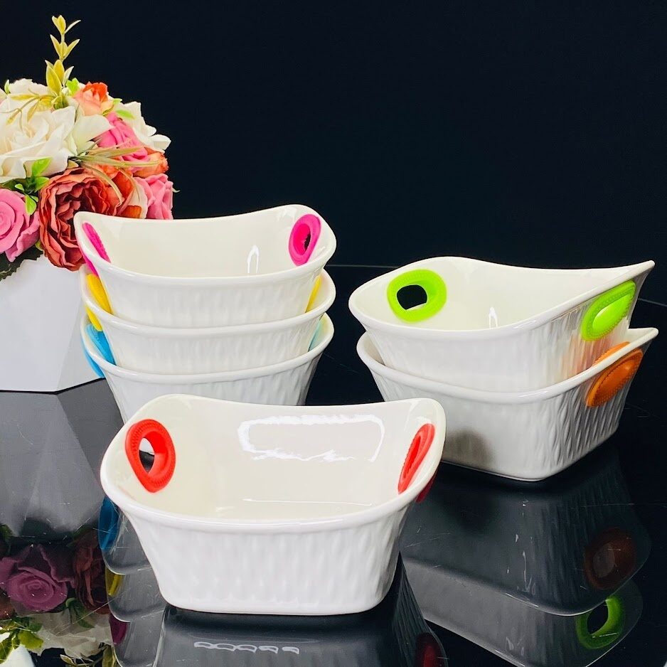 Шт набор из 6 квадратных салатников 13см с силикон.ручками в под.уп. фарфор. Жаропрочный фарфор - серия представлена в виде прямоугольных, квадратных, овальных и круглых блюд разного объема, круглых кастрюль и порционных формочек. Посуду можно использовать в духовке и микроволновой печи. Пища при этом сохраняет естественный вкус и аромат. Посуду можно мыть в посудомоечной машине, а качественная и прочная глазурь защищает блюда от царапин ножа и вилки. ВНИМАНИЕ! Температура приготовления пищи в посуде из фарфора не должна превышать t220C градусов. Категорически запрещается ставить посуду на конфорки электрической плиты или на открытое пламя. Посуду, в которой находились замороженные или охлажденные продукты, не следует сразу из холодильника помещать в горячую духовку.