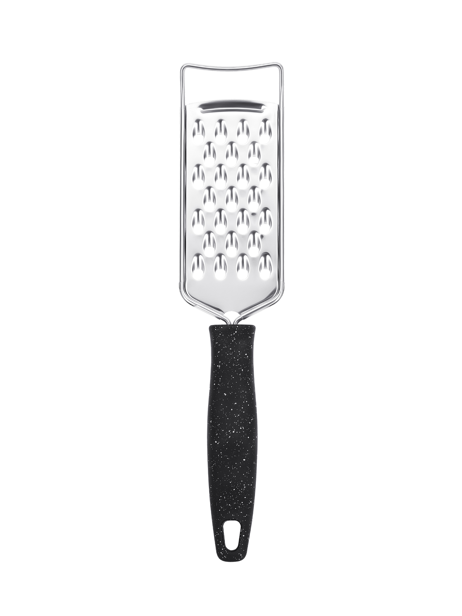 93-bk2c-18 терка для крупной стружки 26х5.5 см linea punto nero. Терка предназначена для нарезки крупной стружкой сыра, шоколада, фруктов, орехов, овощей и других продуктов. Преимущества терки: • Выполнена из высококачественной нержавеющей стали 430, которая отличается хорошей коррозийной устойчивостью, обладают высокой прочностью • Благодаря компактному размеру терки удобно хранить в любых местах (в лотке, в стакане, в выдвижном ящике) • Эргономичная ручка из полипропилена с покрытием soft-touch не скользит и удобно ложится в руку- для этого на ручке имеются специальные выемки под пальцы • Для удобства использования на терках сделан выступ для упора на поверхность: удобно натирать продукты сразу в блюдо • Благодаря качественной заточке терка длительное время остается острой, что позволяет использовать ее для самых разнообразных продуктов, в том числе для сырых овощей и фруктов • Имеется отверстие для подвешивания, благодаря которому терки удобно хранить на крючках • Размер режущей поверхности: 13*5,5 см Материал изготовления: нержавеющая сталь, полипропилен Общая длина изделия, мм: 55 Ширина изделия, мм: 30 Линия: PUNTO NERO Ширина индивидуальной упаковки, мм: 30 Высота индивидуальной упаковки, мм: 260 Вес единичного товара нетто, кг: 0. 064 Высота изделия до самой высокой точки изделия, мм: 260 Штрихкод товара в транспортной упаковке: 14650229055034 Техданные: Размер изделия: 55х30х260 мм; Вес: 0,064 кг; Материал изготовления: нержавеющая сталь, полипропилен. Длина индивидуальной упаковки, мм: 55 Высота изделия (внешняя по борту изделия), мм: 260