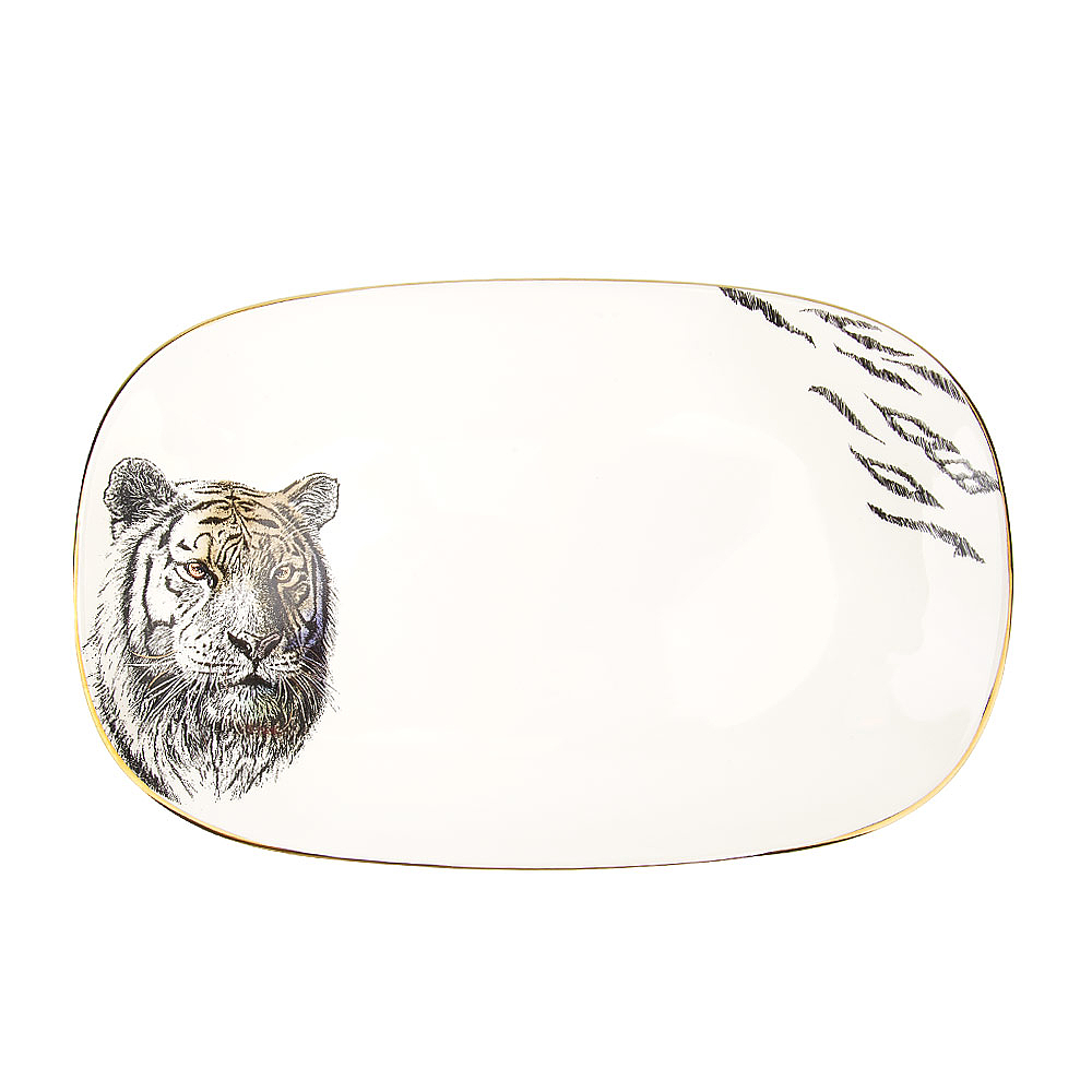 Шт 6шт блюдо сервировочное (с элементами золота) саванна/тигр 25*16*3см. Блюдо сервировочное (с элементами золота) Саванна/Тигр 25*16*3см. (min6) Роскошная коллекция посуды из фаянса «Саванна». Легкий и богатый дизайн коллекции, выполненный в Колониальном стиле, непременно придется по вкусу любителям элегантных и эстетичных решений. Главной темой коллекции стали животные: слон и тигр. Уникальное оформление посуды выполнено методом деколи, а основные золотые части выполнены при помощи электроплейтинга. Часть декоративных элементов прорисованы вручную из натурального 24 каратного золота – бивни у слона, глаза тигра. В коллекции «Саванна» представлен широкий спектр наименований, что позволит без труда собрать набор, подходящий именно Вам. Материал: Фарфор Упаковка: Коричневая коробка Цвет основной: Белый Комплектация: Блюдо - 1 шт Использование в СВЧ: Нет Мытье в посудомоечной машине: Нет Рисунок: Животное Форма: Прямоугольная  развернуть описание ▼