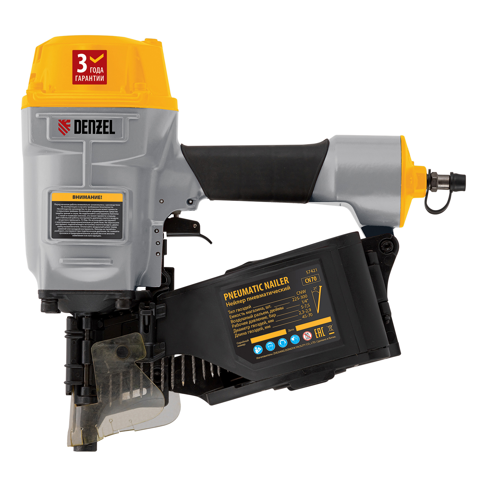 Шт нейлер пневматический cn70 для гвоздей cnw от 45 до 70 мм// denzel. Бренд: DENZEL Гарантия: 3 года Диаметр воздушного штуцера: 1u002F4 Материал корпуса: алюминий Страна бренда: Германия Страна производства: Китай Максимальное давление, бар: 7.5 Тип упаковки: картонная коробка Длина в упаковке, мм: 370 Ширина в упаковке, мм: 330 Высота в упаковке, мм: 140 Вес (брутто), кг: 4.34 Нейлер пневматический: 2 шт Пневматический нейлер Denzel CN70 57421 совместим с барабанными гвоздями типа CNW длиной 45-70 мм и предназначен для проведения строительно-ремонтных работ, а также производства мебели, паллет и других изделий из дерева, таких как тара и упаковка. Максимальное рабочее давление составляет 7,5 бар, что обеспечивает высокую скорость работы и позволяет быстро и эффективно решать поставленные задачи. Преимущества Долговечность — алюминиевый корпус устойчив к механическим воздействиям и коррозии. Эргономичность — обрезиненная рукоятка удобно ложится в руку и не выскальзывает из ладони, что обеспечивает комфорт при длительной работе. Быстрая загрузка барабанных гвоздей — нейлер позволяет эффективно выполнять работы по креплению различных материалов. Готовность к эксплуатации — в комплект поставки входит масленка и шестигранные ключи для настройки и обслуживания. Бесперебойная работа — магазин вмещает до 300 гвоздей, что позволяет длительное время не отвлекаться на загрузку крепежа. Безопасность пользователя — экран защищает от вылета инородных частиц, а блокировка выключателя предотвращает случайное срабатывание механизма. Небольшой вес — инструмент можно удерживать одной рукой, что особенно удобно при работе на вертикальных поверхностях. Гарантия 3 года — надежность пневматического нейлера подтверждена производителем.  развернуть описание ▼