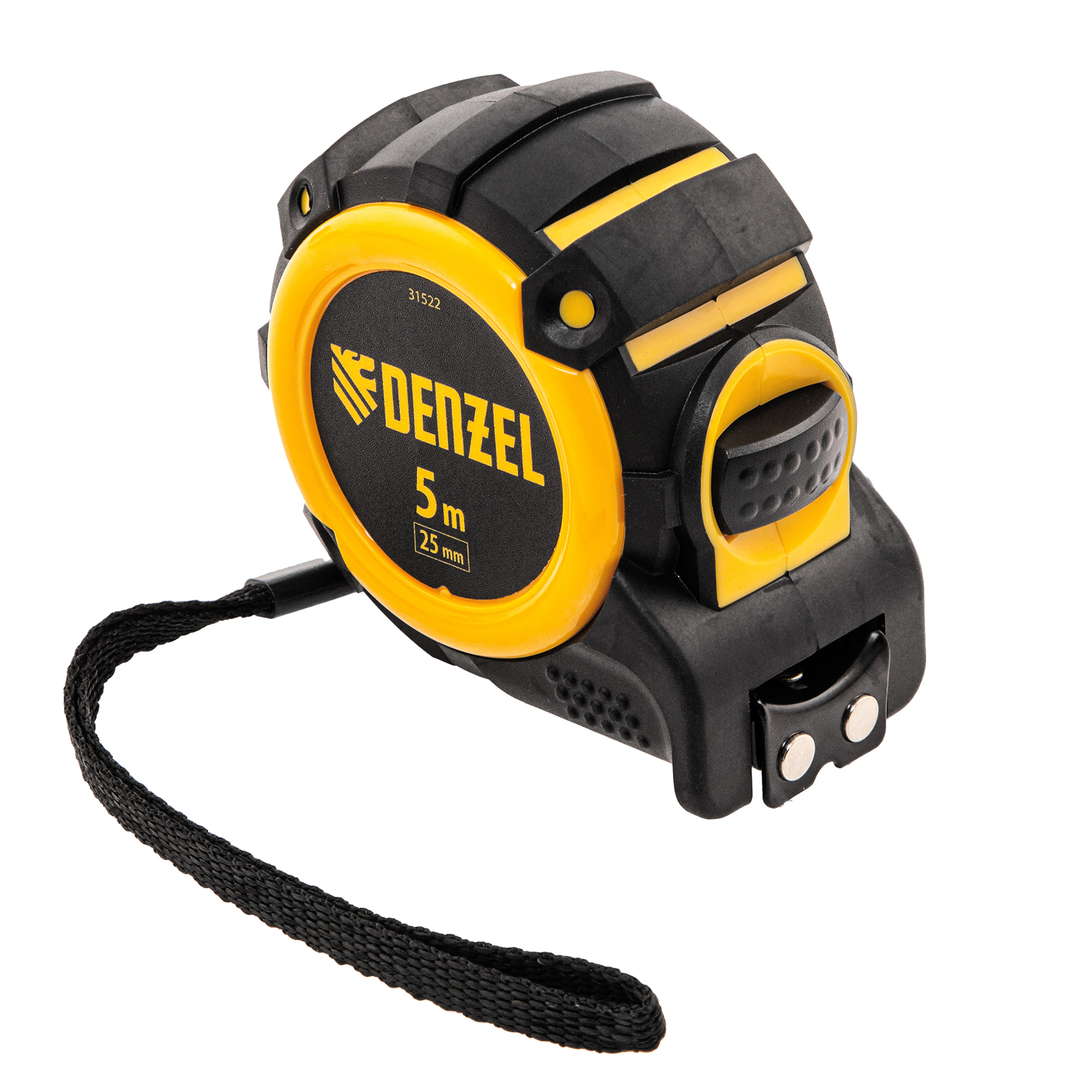 Шт рулетка 5м х 25мм, автоматич. фиксац., нейлон. покрытие, магнит. зацеп, двухстор. разметка denzel. Бренд: DENZEL Материал корпуса: двухкомпонентный Особенности: автостоп, двухкомпонентный корпус, двухстороннее нанесение, магнитный зацеп, нейлон Страна производства: Китай Тип упаковки: подвесная карта Длина в упаковке, мм: 142 Ширина в упаковке, мм: 115 Вес (брутто), кг: 0.32 Рулетка: 1 шт Рулетка Denzel 31522 с автоматической фиксацией полотна размером 5 м х 25 мм, с нейлоновым покрытием, магнитным зацепом и двухсторонней разметкой, предназначена для измерения расстояний и определения габаритов различных предметов. Лента автоматически фиксируется в вытянутом положении, что упрощает работу. Рулетка удобна для работы в труднодоступных местах, будет полезна во время строительных и ремонтных работ. Преимущества Прочность — двухкомпонентный корпус изготовлен из ABS-пластика и термопластичной резины, что снижает риск его поломки в результате случайного падения или удара. Четкая шкала — измерительное полотно с нейлоновым покрытием устойчиво к истиранию. Функциональность — магнитный зацеп надежно фиксируется на металлических поверхностях. Проведение измерений в разных плоскостях — на ленту нанесена двухсторонняя разметка (вертикальная и горизонтальная шкала). Эргономичность — у рулетки имеется 2 кнопки возврата измерительной ленты, что ускоряет работу.  развернуть описание ▼