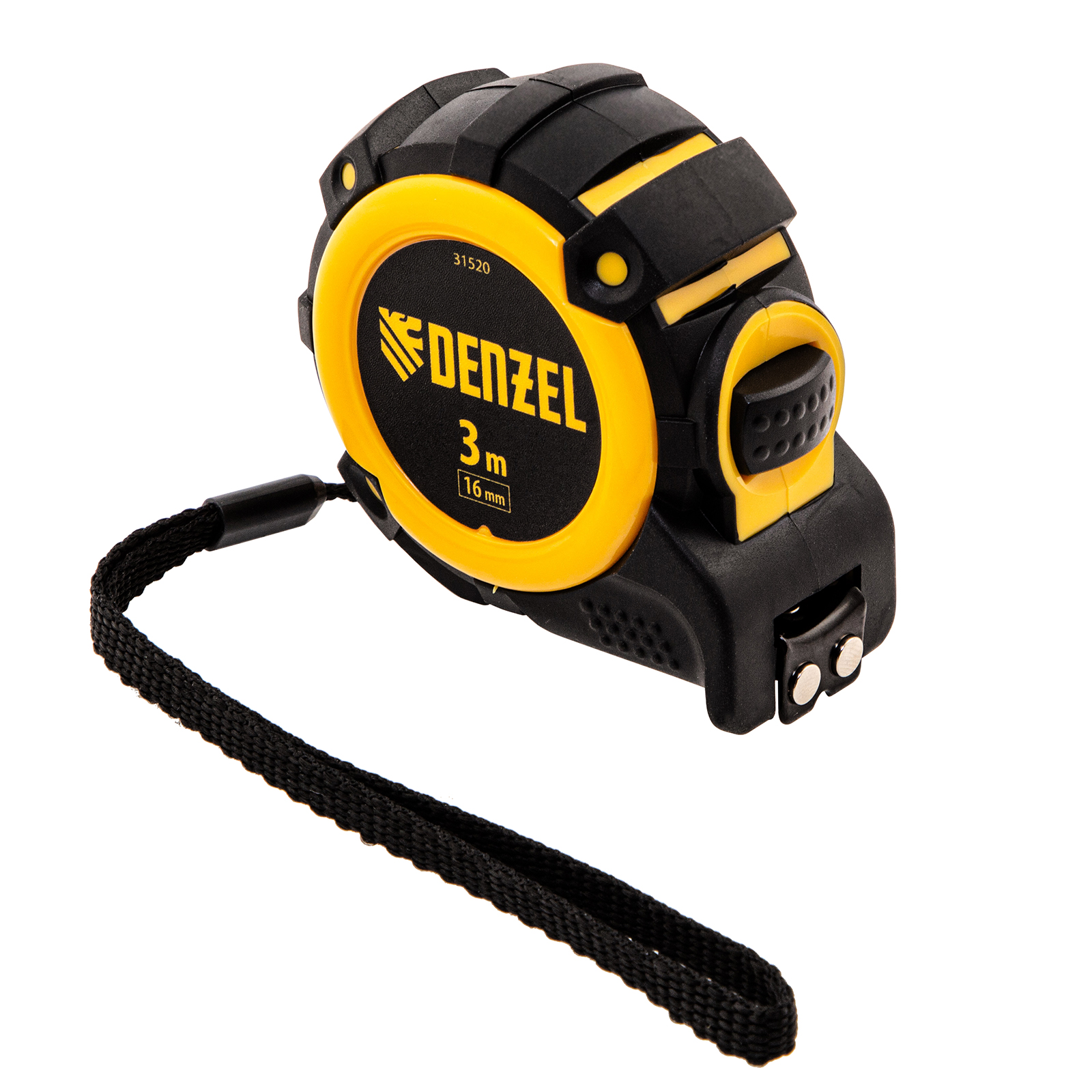 Шт рулетка 3м х 16мм, автоматич. фиксац., нейлон. покрытие, магнит. зацеп, двухстор. разметка denzel. Бренд: DENZEL Материал корпуса: двухкомпонентный Особенности: автостоп, двухкомпонентный корпус, двухстороннее нанесение, магнитный зацеп, нейлон Страна производства: Китай Тип упаковки: подвесная карта Длина в упаковке, мм: 142 Ширина в упаковке, мм: 115 Вес (брутто), кг: 0.17 Рулетка: 1 шт Рулетка Denzel 31520 с автоматической фиксацией полотна размером 3 м х 16 мм, с нейлоновым покрытием, магнитным зацепом и двухсторонней разметкой, предназначена для измерения расстояний и определения габаритов различных предметов. Лента автоматически фиксируется в вытянутом положении, что упрощает работу. Рулетка будет полезна во время строительных и ремонтных работ. Преимущества Прочность — двухкомпонентный корпус изготовлен из ABS-пластика и термопластичной резины, что снижает риск его поломки в результате случайного падения или удара. Четкая шкала — измерительное полотно с нейлоновым покрытием устойчиво к истиранию. Функциональность — магнитный зацеп надежно фиксируется на металлических поверхностях. Проведение измерений в разных плоскостях — на ленту нанесена двухсторонняя разметка (вертикальная и горизонтальная шкала). Эргономичность — у рулетки имеется 2 кнопки возврата измерительной ленты, что ускоряет работу.  развернуть описание ▼