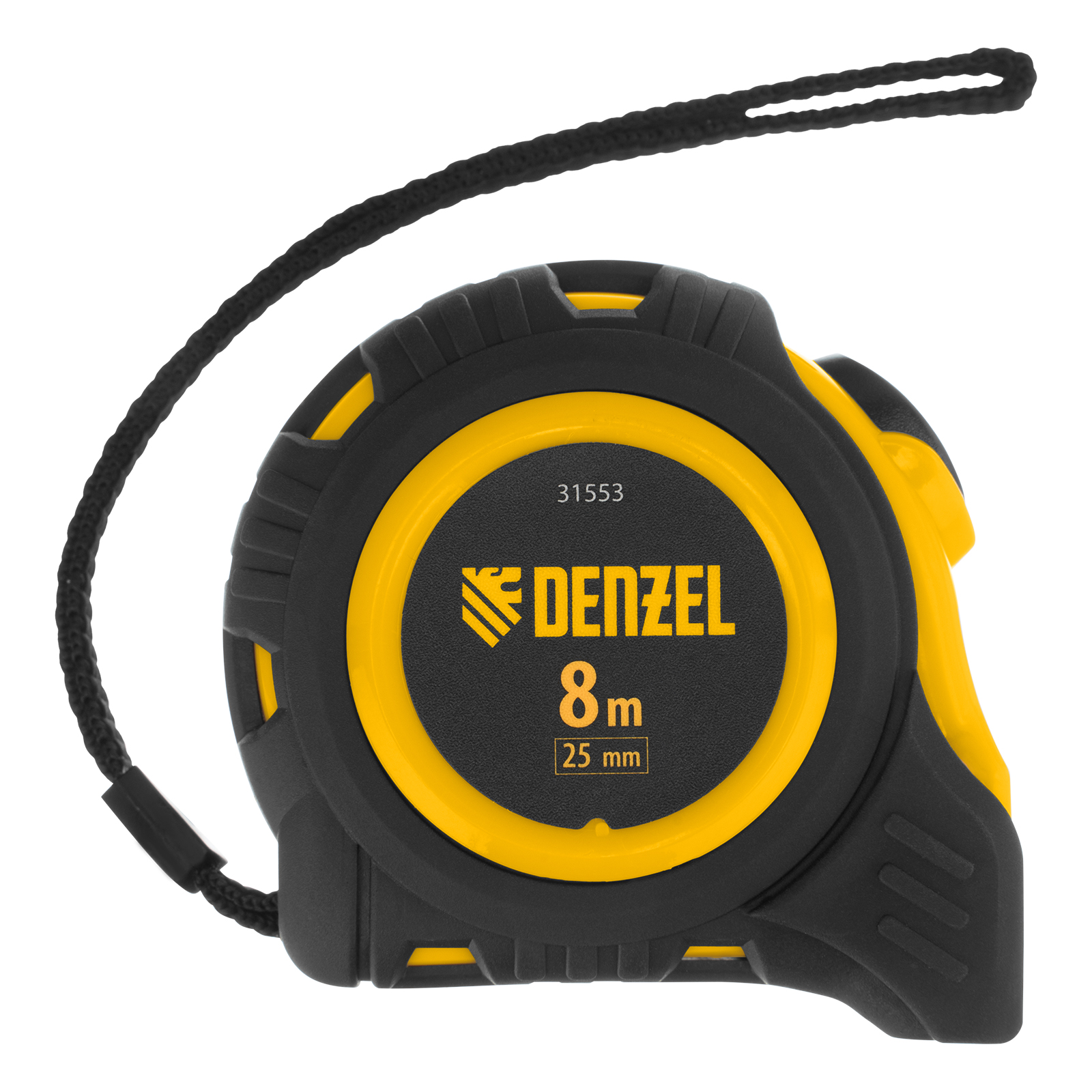 Шт рулетка 8м х 25мм, обрезиненный корпус, автоматическая фиксация denzel. Бренд: DENZEL Особенности: автоматическая фиксация, обрезиненный корпус Страна производства: Китай Длина в упаковке, мм: 106 Высота в упаковке, мм: 145 Вес (брутто), кг: 0.48 Рулетка: 1 шт Рулетка Denzel 31553 в обрезиненном корпусе, с автоматической фиксацией, с полотном шириной 25 мм и длиной 8 м, используется для измерения расстояний и размеров предметов. Стальная лента с эмалевым покрытием и защитной пластиной в месте крепления зацепа рассчитана на долгий срок службы. Рулетка будет полезна во время строительства и ремонта, а также пригодится в быту. Преимущества Ударопрочность — обрезиненный корпус устойчив к механическим повреждениям, возвратная пружина выполнена из стали 65 Mn. Удобная эксплуатация — автоматическая фиксация ленты облегчает проведение измерений. Долговечная конструкция — на измерительном полотне предусмотрен роликовый механизм фиксации, снижающий его трение о поверхность. Эргономичность — рулетка снабжена прочным ремешком для подвешивания на запястье. Дополнительные возможности — поясной зажим позволяет закрепить рулетку на ремне, чтобы освободить руки во время работы. Продуманная упаковка — открытый блистер позволяет осмотреть инструмент перед покупкой. Подтвержденное качество — инструменту присвоен II класс точности (сертификация CE (LNE)).  развернуть описание ▼