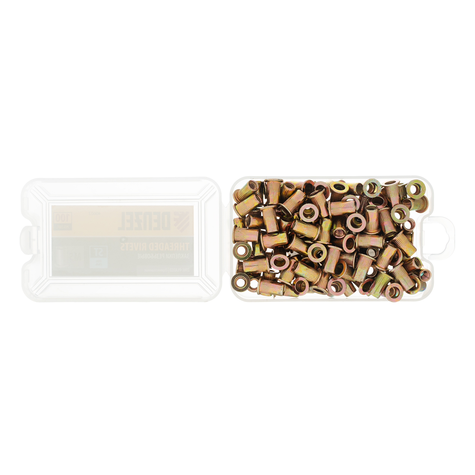 Шт заклепки резьбовые, стальные, оцинкованные, м5, пластиковый кейс, 100 шт. denzel. Бренд: DENZEL Материал заклепки: сталь Страна производства: Китай Длина в упаковке, мм: 105.5 Ширина в упаковке, мм: 64 Высота в упаковке, мм: 25.5 Вес (брутто), кг: 0.211 Заклепки резьбовые: 100 шт Пластиковый кейс: 1 шт Стальные резьбовые заклепки Denzel 40602, с резьбой M5, оцинкованные, предназначены для скрепления листовых материалов толщиной 0,5-2,5 мм. Совместимы с заклепочником Denzel 40501. Позволяют получить резьбовое соединение даже при одностороннем доступе к месту крепления. Крепежные элементы используются для проведения строительных и монтажных работ, пригодятся на даче и в гараже. Преимущества Прочность — заклепки изготовлены из стали, поэтому выдерживают значительные нагрузки. Долговечность — крепеж оцинкован для защиты от коррозии. Надежное соединение — благодаря насечкам на рабочей части заклепки неподвижно фиксируются в отверстиях, стандартный бортик увеличивает площадь прижимной поверхности. Удобное хранение и транспортировка — заклепки поставляются в прочном пластиковом кейсе с защелкой.  развернуть описание ▼