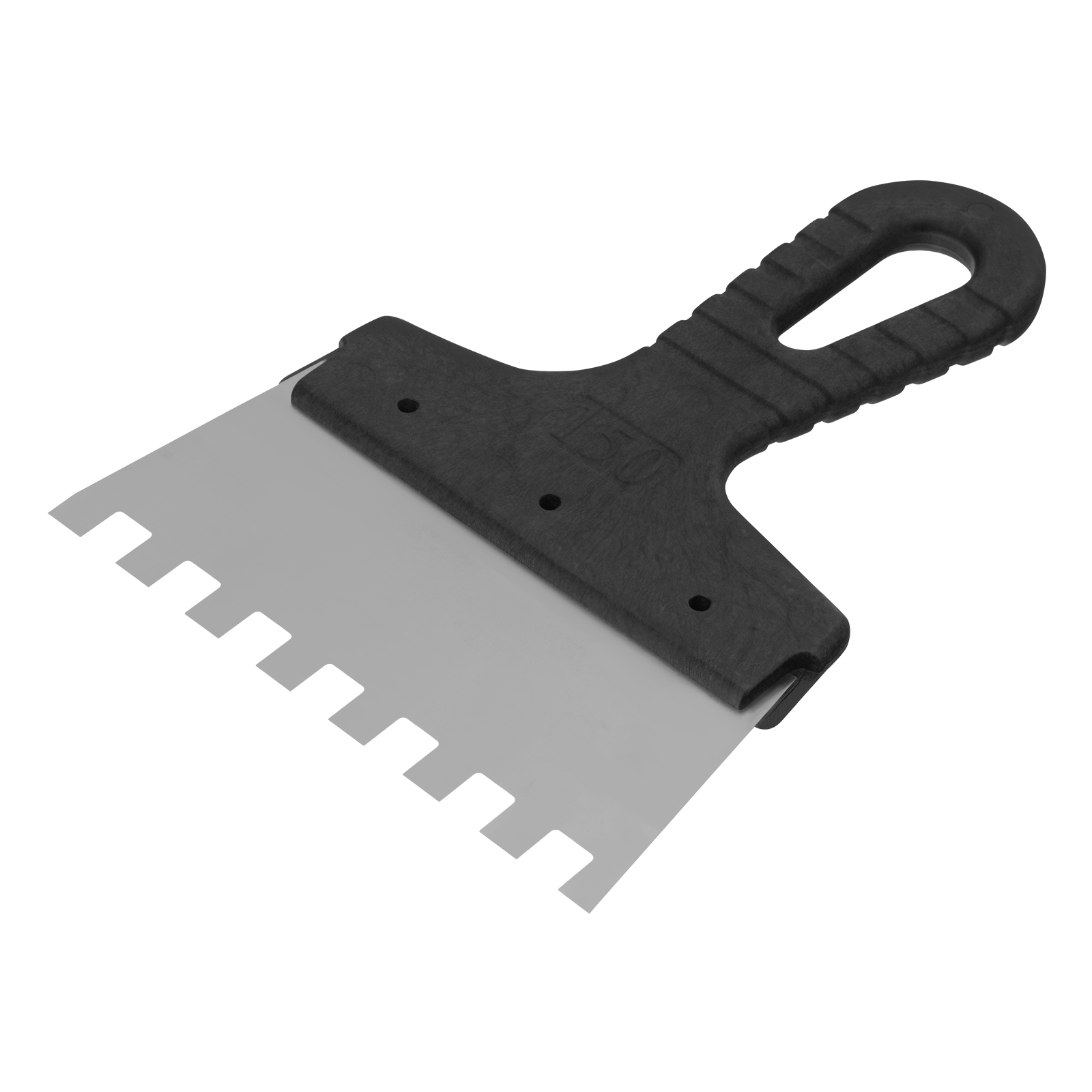 Шт шпатель из нержавеющей стали, 150 мм, зуб 10 х 10 мм, пластмассовая ручка сибртех. Бренд: Сибртех Материал полотна: нержавеющая сталь Материал рукоятки: пластмасса Ширина полотна: 150 мм Страна производства: Россия Тип упаковки: без упаковки Длина в упаковке, мм: 205 Ширина в упаковке, мм: 150 Вес (брутто), кг: 0.105 Шпатель: 1 шт Шпатель Сибртех 85480 из нержавеющей стали, шириной 150 мм, с пластмассовой рукояткой и зубьями 10 х 10 мм, применяется во время проведения работ по укладке плитки, мозаики и т. д. Квадратные зубья облегчают нанесение клеевого состава, позволяя равномерно распределять его по поверхности. Зубья размером 10 х 10 мм рассчитаны на плитку площадью 900-2500 см2. Преимущества Упругость — полотно быстро восстанавливает свою форму при изгибающих нагрузках. Коррозионная стойкость — рабочее полотно выполнено из нержавеющей стали. Комфортная эксплуатация — наклонная рукоятка облегчает нанесение и выравнивание раствора. Эргономичность — за счет рельефной текстуры рукоятка удобно ложится в руку и не выскальзывает из ладони. Удобное хранение — в рукоятке предусмотрено отверстие для подвешивания шпателя.  развернуть описание ▼