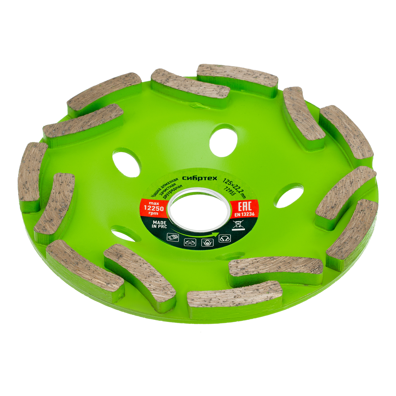 2шт чашка алмазная зачистная 125 мм, двухрядная сибртех. Бренд: Сибртех Материал обработки: бетон, гранит, камень, кирпич, мрамор Основание: штампованное Посадочный диаметр: 22,20 мм Страна производства: Китай Диаметр, мм: 125 Тип упаковки: картонная коробка Длина в упаковке, мм: 170 Ширина в упаковке, мм: 130 Вес (брутто), кг: 0.47 Чашка алмазная: 1 шт Двухрядная зачистная алмазная чашка Сибртех 72955 диаметром 125 мм устанавливается на углошлифовальную машину с посадочным размером 22,2 мм. Оптимальна для интенсивной черновой обработки и подготовки к последующей отделке бетонных, каменных, мраморных, кирпичных и гранитных поверхностей. С помощью чашки можно снять толстый слой бетона, выровнять швы и устранить наплывы после снятия опалубки, удалить крупные дефекты. Изделие предназначено для бытового применения. Преимущества Увеличенный ресурс — рабочая часть состоит из высокопрочных синтетических алмазов и имеет высоту 5 мм. Эффективная работа — алмазные сегменты расположены на рабочей поверхности в 2 ряда, а отверстия на корпусе обеспечивают своевременный отвод шлама. Коррозионная стойкость — стальной корпус покрыт эмалью для защиты от воздействия влаги.  развернуть описание ▼