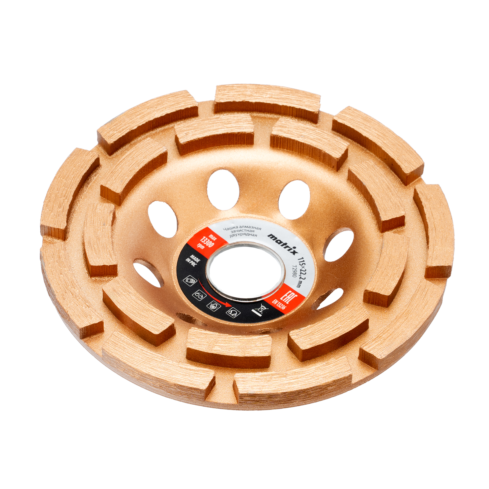 2шт чашка алмазная зачистная, 115 мм, двухрядная matrix. Бренд: Matrix Материал обработки: бетон, гранит, камень, кирпич, мрамор Основание: штампованное Посадочный диаметр: 22,20 мм Страна производства: Китай Диаметр, мм: 115 Тип упаковки: картонная коробка Длина в упаковке, мм: 160 Ширина в упаковке, мм: 120 Вес (брутто), кг: 0.44 Чашка алмазная: 1 шт Двухрядная алмазная зачистная чашка Matrix 72980 диаметром 115 мм, с посадочным отверстием 22,2 мм, — оснастка для углошлифовальных машин, предназначенная для грубой обработки бетонных, каменных, кирпичных, мраморных и гранитных поверхностей. Позволяет проводить зачистку швов, стыков, неровностей, удаление наплывов. Придает поверхности шероховатость для улучшения ее адгезивной способности перед нанесением строительных растворов. Чашка предназначена для профессионального применения. Преимущества Высокий ресурс — рабочий слой толщиной 5 мм характеризуется увеличенной плотностью алмазов и сбалансированной связкой. Производительность — сегменты рабочей части расположены в 2 ряда, поэтому насадка снимает толстый слой материала. Эффективность и долгий срок службы — в корпусе предусмотрены отверстия для отвода шлама и тепла. Устойчивость к воздействию влаги — стальной корпус покрыт эмалью для защиты от коррозии. Гарантированное качество — чашка произведена на специализированном заводе с соблюдением всех технологический требований.  развернуть описание ▼