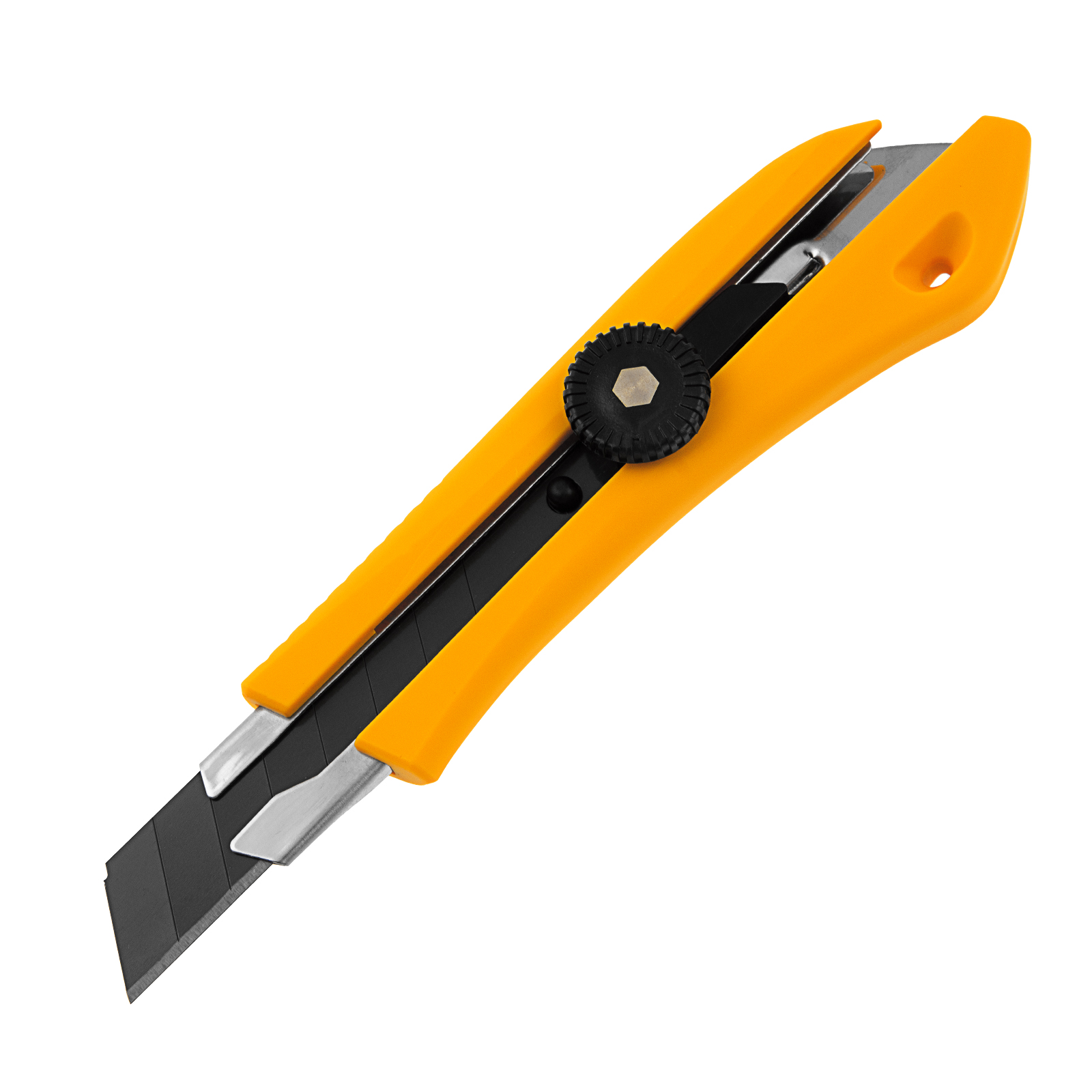 Шт нож, 18 мм, сменное лезвие, sk4, метал. направляющая, винтовой фиксатор denzel. Бренд: DENZEL Материал корпуса: ABS-пластик Материал лезвия: SK4 Форма лезвия: прямое Цвет: желтый Страна производства: Китай Тип упаковки: блистер Длина в упаковке, мм: 215 Ширина в упаковке, мм: 85 Вес (брутто), кг: 0.11 Нож: 1 шт Нож Denzel 78943 со сменным лезвием шириной 18 мм, изготовленным из стали SK4, оснащен винтовым фиксатором и металлической направляющей. Сверхострое выдвижное лезвие легко режет линолеум, ковролин, бумагу, обои, картон и другие листовые материалы. Нож рекомендован для профессионального применения, пригодится также в домашнем хозяйстве. Благодаря сегментной структуре полотна можно быстро восстановить работоспособность ножа: достаточно отломить затупившийся сегмент по линии насечки при помощи плоскогубцев или другого шарнирно-губцевого инструмента. При обламывании необходимо использовать средства индивидуальной защиты (очки и перчатки). Преимущества Прочность и износостойкость — лезвие изготовлено из японской инструментальной стали SK4, режущая кромка твердостью 65 HRC долго сохраняет остроту. Надежность — благодаря металлической направляющей лезвие не сломается даже при высоких нагрузках. Удобное использование — винтовой фиксатор удерживает лезвие в нужном положении. Комфортная работа — корпус из ABS-пластика удобно ложится в руку.  развернуть описание ▼
