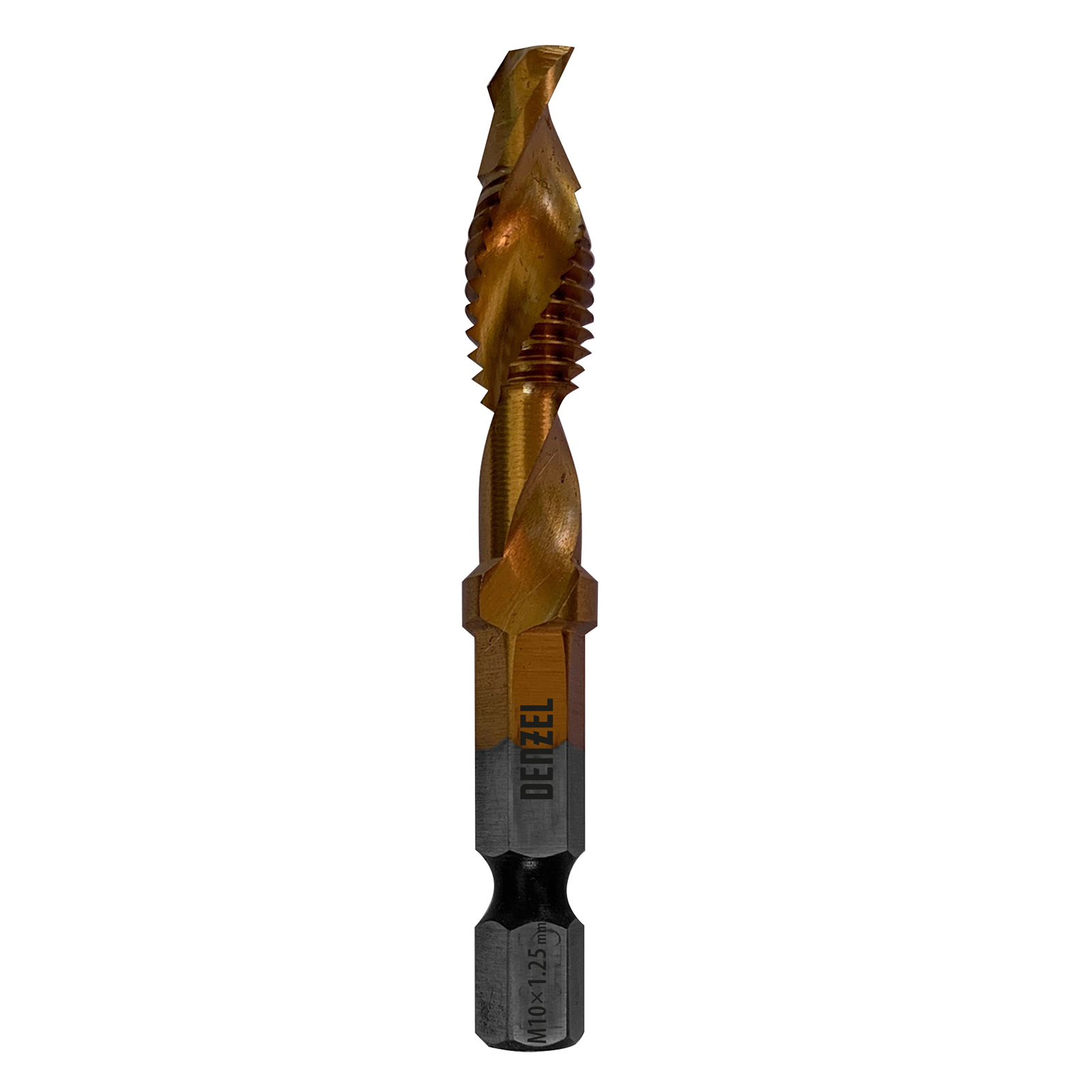 Шт сверло-метчик м10 х 1,25 мм, р6м5// denzel. Бренд: DENZEL Направление резьбы: правое Сталь: быстрорежущая сталь Тип резьбы: M10 Страна производства: Китай Шаг резьбы М, мм: 1.25 Тип упаковки: блистер-картон Ширина в упаковке, мм: 50 Вес (брутто), кг: 25.4 Сверло-метчик М10 х 1,25 мм: 1 шт Сверло-метчик Denzel 76724 из стали P6M5 предназначено для получения глухих и сквозных отверстий в металлических заготовках с одновременным нарезанием правой резьбы M10 с шагом 1,25 мм. Позволяет существенно сэкономить время работы, объединив две операции в одну. Угол заточки 135° оптимален для работы с чугуном, сталью, алюминием, медью, бронзой. Ресурс оснастки увеличен в 10 раз по сравнению с аналогичными моделями из углеродистой стали. Преимущества Прочность — оснастка из быстрорежущей стали обеспечивает высокую эффективность работы в течение длительного времени. Долговечность — нитридтитановое покрытие защищает от повреждений и уменьшает трение, что увеличивает устойчивость сверла-метчика к износу. Быстрое засверливание — благодаря подточенной поперечной кромке можно приступать к работе без предварительной разметки поверхности (накернивания). Высокое качество выполняемых работ — сверлу-метчику присвоен класс точности 4H. Удобный поиск среди других инструментов — на хвостовик нанесена лазерная гравировка с обозначением типоразмера. Надежная фиксация — шестигранный хвостовик не проворачивается в патроне электроинструмента.  развернуть описание ▼