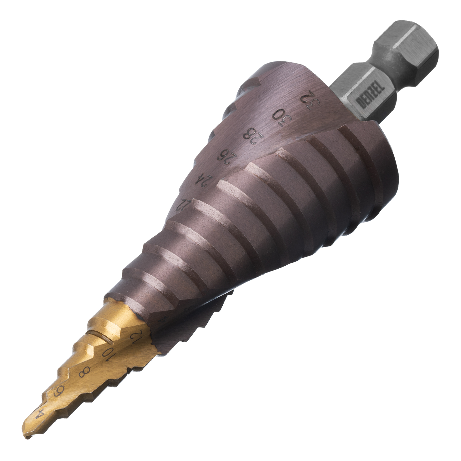 Сверло ступенчатое, 4-6-8-10-12-14-16-18-20-22-24-26-28-30-32 мм, р6м5к5, 6-гр. хвостовик denzel. Бренд: DENZEL Класс точности: А1 Материал обработки: металл, пластик Тип хвостовика: шестигранный Страна производства: Китай Диаметр хвостовика, мм: 11.1 Тип упаковки: блистер Длина в упаковке, мм: 200 Ширина в упаковке, мм: 97 Вес (брутто), кг: 0.22 Сверло ступенчатое: 1 шт Ступенчатое сверло Denzel 723616 из стали P6M5K5, с 6-гранным хвостовиком, предназначено для сверления отверстий диаметром от 4 до 32 мм в сталях, цветных металлах и пластике. Избавляет от необходимости иметь при себе целый набор традиционных сверл. Позволяет получать отверстия с ровными краями и уже снятой фаской под гайку или болт. Оснастке присвоен класс точности A1. Сверло пригодится дома и в мастерской. Преимущества Эффективность — оснастка из прочной быстрорежущей стали P6M5K5, легированной вольфрамом, молибденом и кобальтом, максимально устойчива к интенсивным динамическим нагрузкам. Высокий ресурс — рабочие части твердостью 62-64 HRC долго сохраняют режущие свойства. Долговечность — нитридтитановое покрытие повышает стойкость к перегреву и предотвращает образование коррозии, также сверло покрыто техническим маслом для дополнительной защиты от разрушения. Быстрое начало работы — заточка Split point позволяет приступать к сверлению сразу, без предварительной разметки поверхности (накернивания) и засверливания. Надежная фиксация — шестигранный хвостовик не проворачивается в патроне дрели. Удобная упаковка — внутри блистера находится пластиковый кейс, обеспечивающий удобное хранение сверла.  развернуть описание ▼