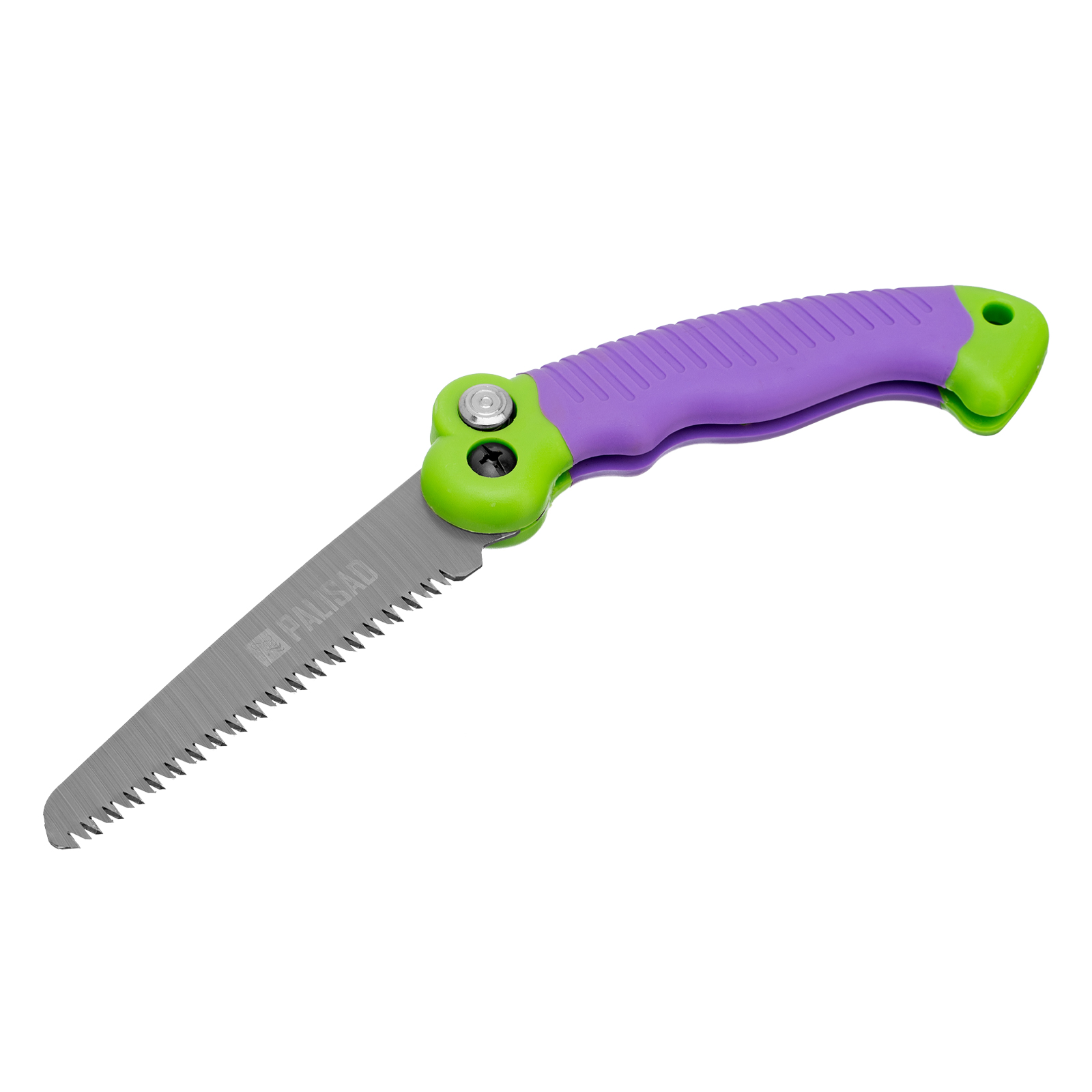 Шт пила садовая складная, 115 мм рабочая часть, пластиковая обрезиненная рукоятка, palisad. Бренд: Palisad Материал рукоятки: полипропилен Особенности: для поперечно-продольного распила, складное полотно Покрытие полотна: лак Покрытие рукоятки: термопластичная резина Тип зубьев: 3D Шаг зубьев: 9-10 TPI Страна бренда: Германия Страна производства: Китай Длина полотна, мм: 115 Общая длина в разложенном виде, мм: 270 Тип упаковки: блистер Длина в упаковке, мм: 290 Вес (брутто), кг: 0.15 Пила: 1 шт Упаковка: 1 шт Садовая складная пила Palisad 60415 с рабочей частью длиной 115 мм и пластиковой обрезиненной рукояткой — удобный и компактный инструмент, который будет полезен не только в саду или на строительной площадке, но и в походе. Позволяет обрезать ветки деревьев, выполнять продольный и поперечный рез сухой или сырой древесины. Зубья с трехгранной заточкой обеспечивают эффективную работу при минимальных усилиях со стороны пользователя. Преимущества Прочность и долговечность — полотно изготовлено из рессорно-пружинной стали и покрыто лаком для защиты от коррозии. Обрезка живых веток — шаг зубьев составляет TPI 9-10, что обеспечивает чистый и ровный рез. Эффективная работа — зубья закалены до необходимой твердости, разведены и остро заточены. Продуманная конструкция — рукоятка одновременно служит ножнами для лезвия. Комфортная работа — двухкомпонентная обрезиненная рукоятка с рифленой поверхностью не выскальзывает из руки. Безопасное хранение и транспортировка — кнопочный фиксатор надежно удерживает лезвие в сложенном состоянии.  развернуть описание ▼