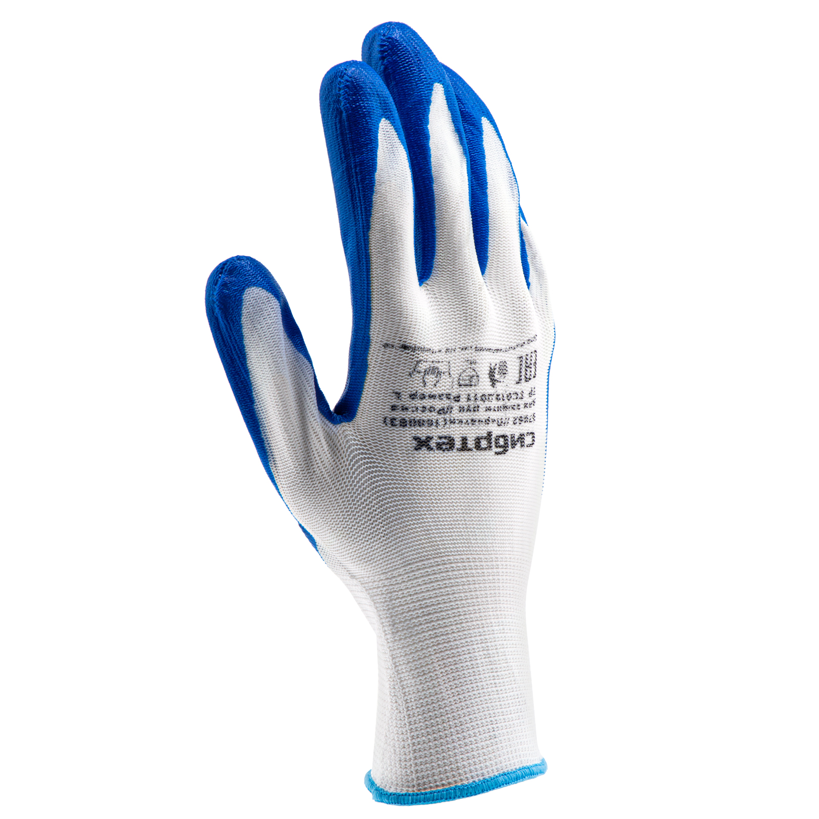 Шт перчатки полиэфирные с синим нитрильным покрытием, размер l, 15 класс вязки сибртех. Бренд: Сибртех Материал основы: полиэфир Обливные: Нет Цвет: белый Страна производства: Россия Длина, мм: 240 Ширина в упаковке, мм: 130 Вес (брутто), кг: 0.04 Перчатки: 1 пара Полиэфирные перчатки Сибртех 67862 с синим нитрильным покрытием, 15 класса вязки, размера L, предназначены для выполнения хозяйственных, ремонтных, строительных и автослесарных работ, в том числе предполагающих контакт с агрессивными веществами. Покрытие из нитрила защищает кожу рук от попадания бензина, масла или краски, а также от влаги и загрязнений. Плотная пряжа предохраняет ладони от царапин, ссадин, порезов и мозолей. Перчатки будут полезны дома, в гараже или на даче. Преимущества Долговечность — перчатки изготовлены из полиэфирной пряжи, обладающей высокой прочностью на разрыв и устойчивостью к истиранию. Эффективное выполнение точных работ — тонкое полотно обеспечивает тактильную чувствительность пальцев. Надежный хват — нитрильное покрытие не скользит по поверхности инструмента. Плотная посадка — эластичные манжеты надежно фиксируются на запястьях, поэтому перчатки не сползают с кистей рук. Гипоаллергенность — материал перчаток безопасен для здоровья. Комфортная работа — трикотажная ткань приятна на ощупь и обеспечивает хороший воздухообмен, благодаря чему кожа рук дышит и не потеет.  развернуть описание ▼