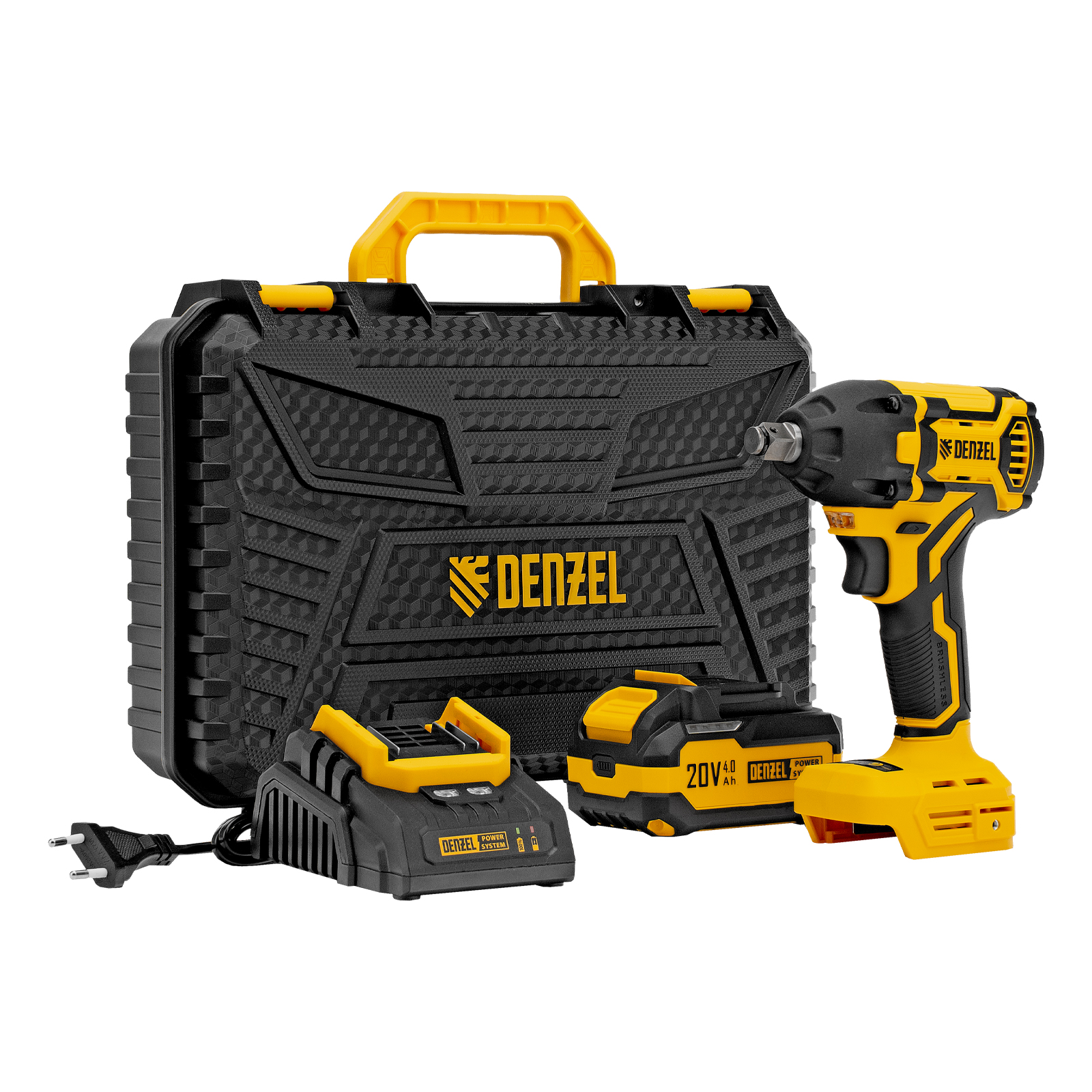 Шт гайковерт ударный аккумуляторный бесщет. ciwh-bl-20-350, li-ion, 20 в// denzel. Бренд: DENZEL Гарантия: 3 года Тип аккумулятора: Li-Ion Тип двигателя: бесщеточный Тип патрона: квадрат 1u002F2 Частота вращения шпинделя: 0-1500u002F0-2000u002F0-2500 обu002Fмин Частота ударов: 0-2100u002F0-2800u002F0-3500 удu002Fмин Страна бренда: Германия Страна производства: Китай Максимальный крутящий момент, Н·м: 350 Тип упаковки: кейс Длина в упаковке, мм: 385 Ширина в упаковке, мм: 120 Высота в упаковке, мм: 270 Вес (брутто), кг: 3.2 Руководство по эксплуатации с гарантийным талоном: 1 шт Аккумуляторный ударный гайковерт Denzel CIWH-BL-20-350 26520 с бесщеточным двигателем работает от аккумулятора Li-Ion 20 В и используется для закручивания и откручивания гаек, болтов и другого резьбового крепежа. Доступно 3 режима работы, при которых частота вращения шпинделя составляет 0-1500, 0-2000 и 0-2500 об/мин, а частота ударов — 0-2100, 0-2800 и 0-3500 уд/мин. Реализована функция электронной регулировки частоты вращения в зависимости от степени нажатия на клавишу пуска, что позволяет установить оптимальную скорость и усилие затяжки. Максимальный крутящий момент составляет 350 Н·м — этого достаточно для эффективного решения поставленных задач. Ударный механизм упрощает работу с туго затянутым и заржавевшим крепежом. Преимущества Стабильная работа — надежный бесщеточный двигатель обеспечивает высокую производительность в течение длительного времени. Тормоз выбега шпинделя — вращение останавливается сразу после выключения, что облегчает работу и повышает ее эффективность. Простое управление — выбор режима производится путем нажатия на специальную кнопку, индикатор показывает, какой режим включен в данный момент. Реверс — возможность быстрого переключения между задачами упрощает работу. Удобная работа при слабом освещении — подсветка рабочей зоны включается одновременно с запуском двигателя. Универсальность — аккумулятор Li-Ion емкостью 4 А·ч совместим со всеми инструментами единой платформы Denzel Power System 20V. Своевременная подзарядка — уровень заряда аккумулятора можно оценить при помощи индикатора. Готовность к работе — аккумулятор и зарядное устройство входят в комплект поставки. Степень защиты II — риск поражения электрическим током сведен к минимуму. Защита от случайного включения — установка переключателя реверса в среднее положение блокирует непредвиденный запуск двигателя. Дополнительные возможности — гайковерт можно закрепить на поясе, чтобы освободить руки при необходимости. Эргономичность — прорезиненная рукоятка гасит вибрации и обеспечивает удобный хват. Надежная упаковка — инструмент поставляется в прочном кейсе, удобном для хранения и транспортировки. Гарантия 3 года — высокое качество гайковерта подтверждено производителем.  развернуть описание ▼