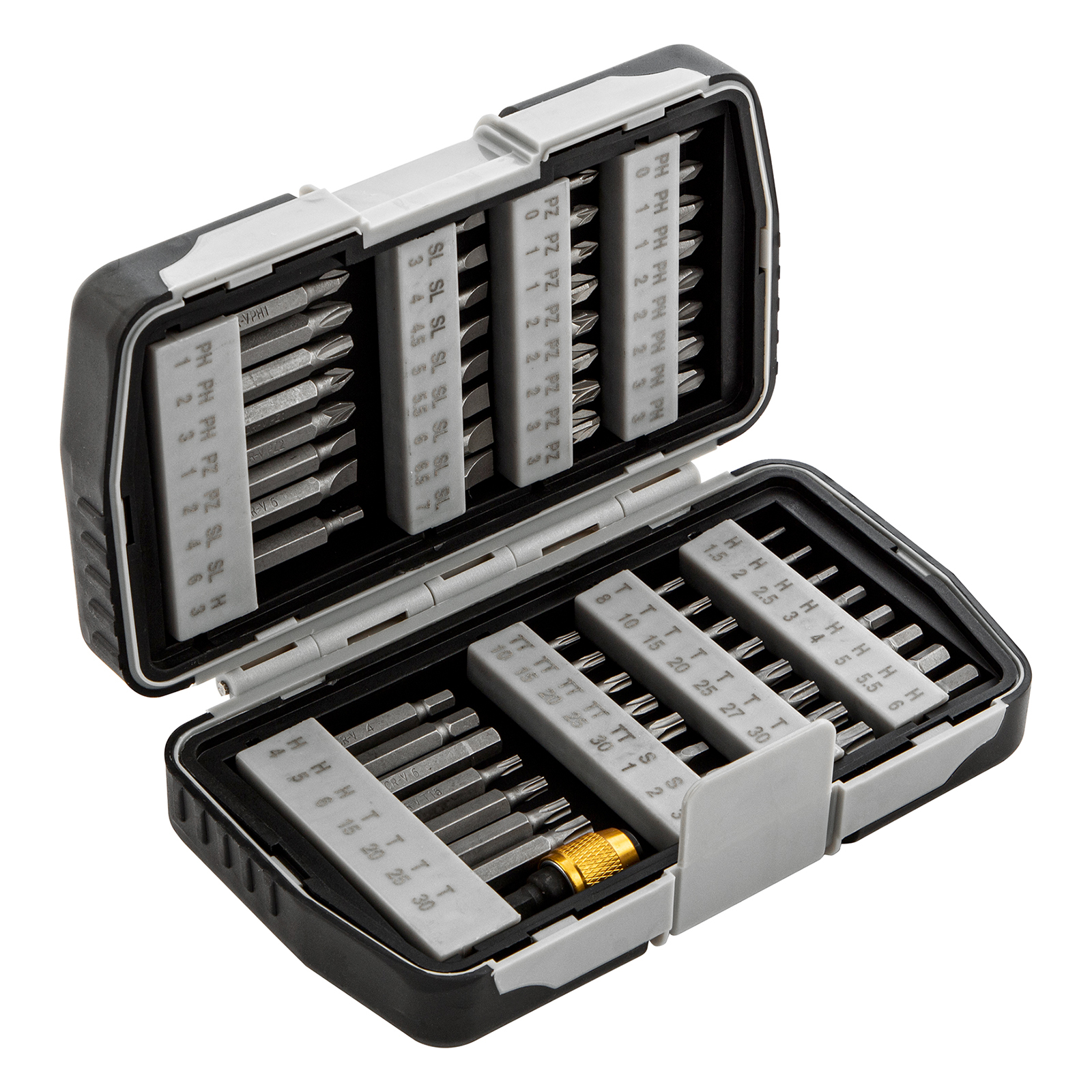 2шт набор бит, магнитный адаптер, crv, пластиковый кейс, 64 шт. matrix. Бренд: Matrix Количество в наборе: 64 Материал биты: CrV Наконечник: H, PH, PZ, S, SL, T, TT Область применения: подходит для шуруповерта Особенности: адаптер Размер хвостовика: 1u002F4 Тип замка: пластик Тип хвостовика: прямой Страна бренда: Германия Страна производства: Китай Тип упаковки: пластиковый кейс Длина в упаковке, мм: 257 Вес (брутто), кг: 0.87 Кейс: 1 шт SL3, SL4, SL4.5, SL5, SL5.5, SL6, H1.5, H2, H2.5, H3, H4, H5, H5.5, H6, T8, T10, T15, T20, T25, T27, T30, T40, TT10, TT15, TT20, TT25, TT27, TT30, Sq1, Sq2, Sq3: 48шт, Биты 50 мм: РН1, РН2, РН3, PZ1, PZ2 Держатель бит: 1 шт Набор Matrix 11327 состоит из 64 предметов, упакованных в пластиковый бокс, и включает биты из стали CrV и магнитный адаптер. Кроме бит длиной 25 мм в комплект входит 15 насадок длиной 50 мм для работы в труднодоступных местах. Оснастки используются совместно с шуруповертами и отвертками для монтажа и демонтажа резьбовых соединений. Преимущества Прочность и коррозионная стойкость — оснастка из хромованадиевой стали выдерживает интенсивное использование. Работа с крепежами различного типа — магнитный адаптер позволяет быстро менять насадки. Надежная фиксация — бита не выпадает из магнитного адаптера во время работы. Продуманное хранение и транспортировка — набор поставляется в удобном пластиковом боксе.  развернуть описание ▼