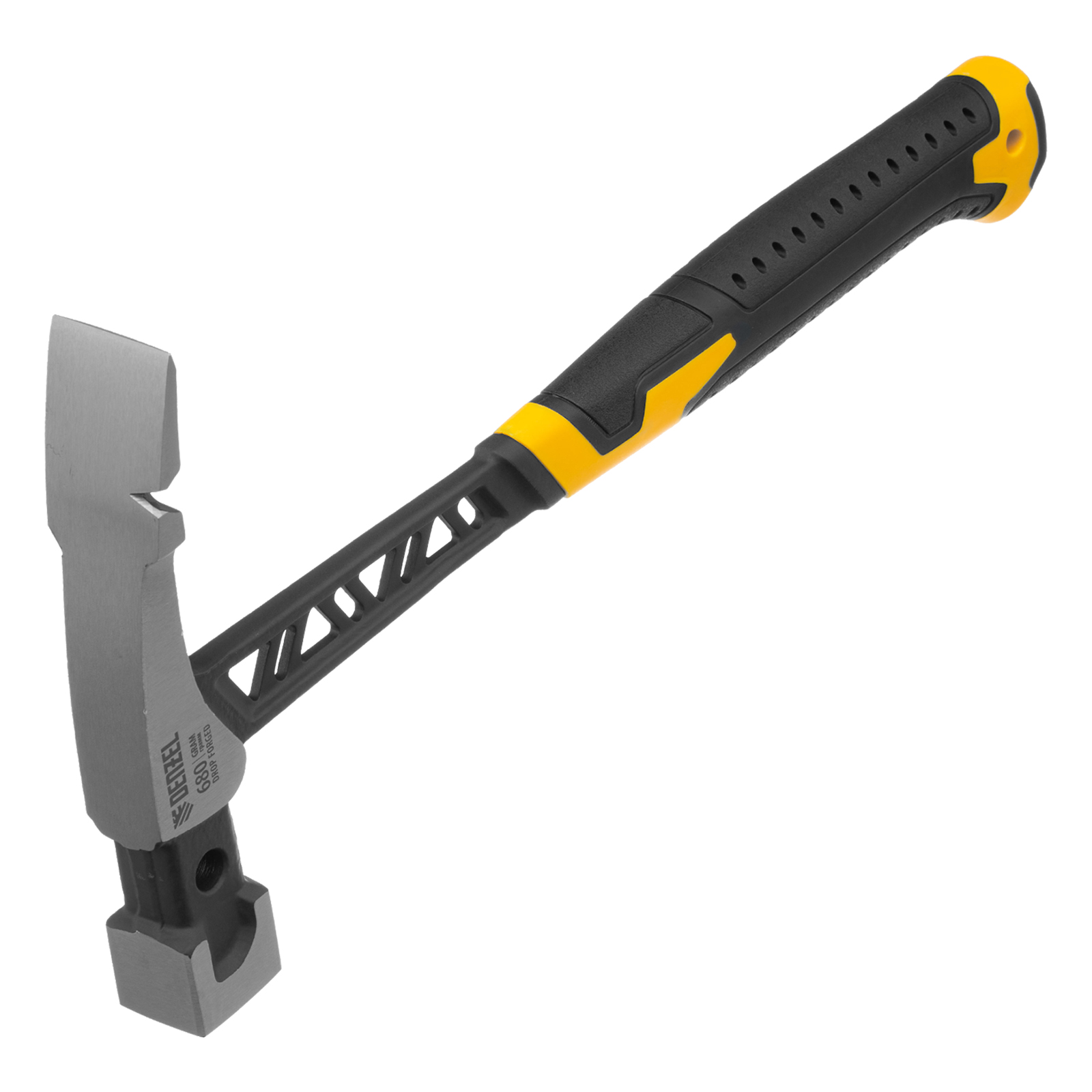 Молоток каменщика 680 г, цельнокованый, двухкомпонентная обрезиненная рукоятка denzel. Бренд: DENZEL Материал бойка: сталь 45 Материал рукоятки: пластик, резина Страна производства: Китай Вес головки, г: 680 Длина в упаковке, мм: 364 Ширина в упаковке, мм: 179 Вес (брутто), кг: 1.2 Молоток: 1 шт Цельнокованый молоток каменщика Denzel 10633 с бойком весом 680 г, с двухкомпонентной обрезиненной рукояткой, используется для выполнения работ с каменной или кирпичной кладкой. Квадратный боек предназначен для нанесения ударов, а удлиненный заточенный носок — для разрубания камня или кирпича. Гвоздодер применяется для выпрямления небольших гвоздей. Преимущества Прочность — головка изготовлена из среднеуглеродистой стали 45, цельнокованый корпус исключает поломку или повреждение рукоятки. Высокий ресурс — твердость бойка составляет 50-55 HRC, поэтому он сохраняет рабочие качества даже при интенсивном использовании. Функциональность — в теле головки имеется отверстие для выгибания прутков и гвоздей. Комфортная работа — двухкомпонентная рукоятка с резиновыми вставками и рифленой поверхностью не выскальзывает из ладони и уменьшает нагрузку на руку мастера.  развернуть описание ▼