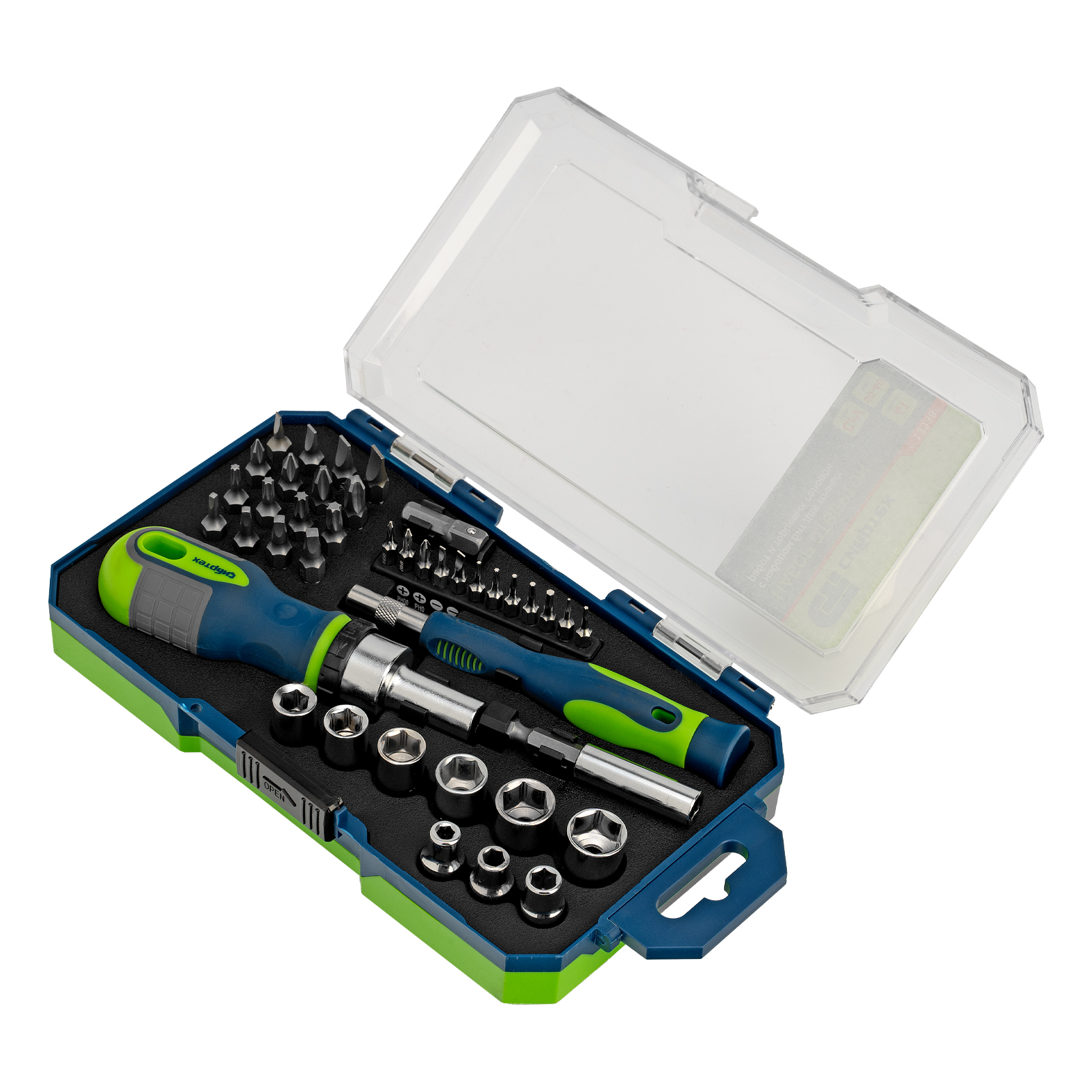 Шт отвертки реверсивные с набором бит и торцевыми головками, 41 шт, crv сибртех. Бренд: Сибртех Особенности: для точных работ Типы шлицов в набор: SLu002FPHu002FPZu002FHEXu002FTORX Страна производства: Китай Тип упаковки: пластиковый кейс Длина в упаковке, мм: 200 Ширина в упаковке, мм: 120 Вес (брутто), кг: 0.6 Торцевые головки: 4, 5, 6, 7, 8, 9, 10, 11, 12 мм: 9 шт Биты для точных работ: PH000, PH00, PH0: 3 шт Биты для точных работ: Pb 0.8, 1.2: 2 шт Биты для точных работ: H1.3, Н1.5, Н2.0: 3 шт Реверсивные отвертки с набором бит и торцевых головок Сибртех 13338, 41 предмет, CrV, включает в себя насадки для работы с крепежом типа SL, PH, PZ, HEX, TORX и торцевые головки для монтажа/демонтажа гаек, болтов, саморезов. Также в нем есть отвертка и биты для точных работ, с помощью которых можно осуществить ремонт мелкой электроники, очков, детских игрушек и т.д. Удлинитель позволяет проводить работы в труднодоступных местах. Преимущества Прочность и износостойкость — биты, торцевые головки и стержни отверток изготовлены из высококачественной хромованадиевой стали. Функция реверса — легко проводить монтаж/демонтаж крепежа, усталость в руках снижается при больших объемах работ. Эргономичные двухкомпонентные рукоятки — инструменты не проскальзывают в руке. Детали набора не потеряются — инструменты поставляются в пластиковом кейсе на защелке с ложементом.  развернуть описание ▼
