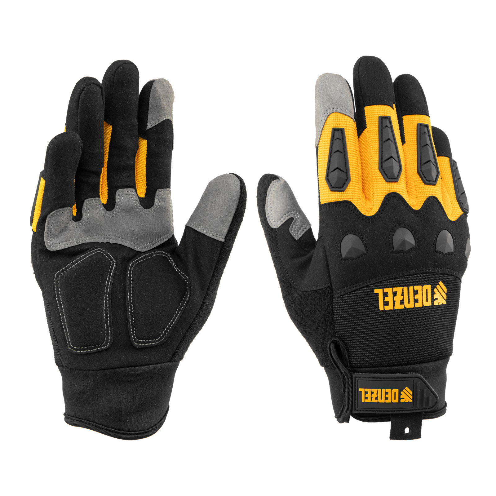 2шт перчатки универсальные, усиленные, с защитными накладками, размер 9 denzel. Бренд: DENZEL Материал подклада: неопрен, полиамид, поливинилхлорид, полиуретан, полиэстер, спандекс Цвет: черно-желтый Страна производства: Китай Длина, мм: 250 Ширина, мм: 114.5 Тип упаковки: подвесная карта Длина в упаковке, мм: 350 Ширина в упаковке, мм: 145 Вес (брутто), кг: 0.11 Перчатки: 1 пара Универсальные усиленные перчатки Denzel 68002 размера 9, с защитными накладками, предотвращают появление царапин и мозолей во время работы с ручным инструментом. Анатомически скроенные, они плотно облегают кисти рук, не сковывая движения пальцев. Перчатки используются при выполнении строительных, ремонтных, слесарных и столярных работ. Преимущества Прочность — перчатки изготовлены из полиэстера, неопрена, полиамида и других материалов, устойчивых к разрыву и истиранию. Защита от мозолей — на ладонной части имеются специальные накладки. Забота о суставах — пальцы усилены защитными PVC-накладками. Манжеты на «липучке» — перчатки надежно фиксируются на запястьях и не сползают во время работы.  развернуть описание ▼