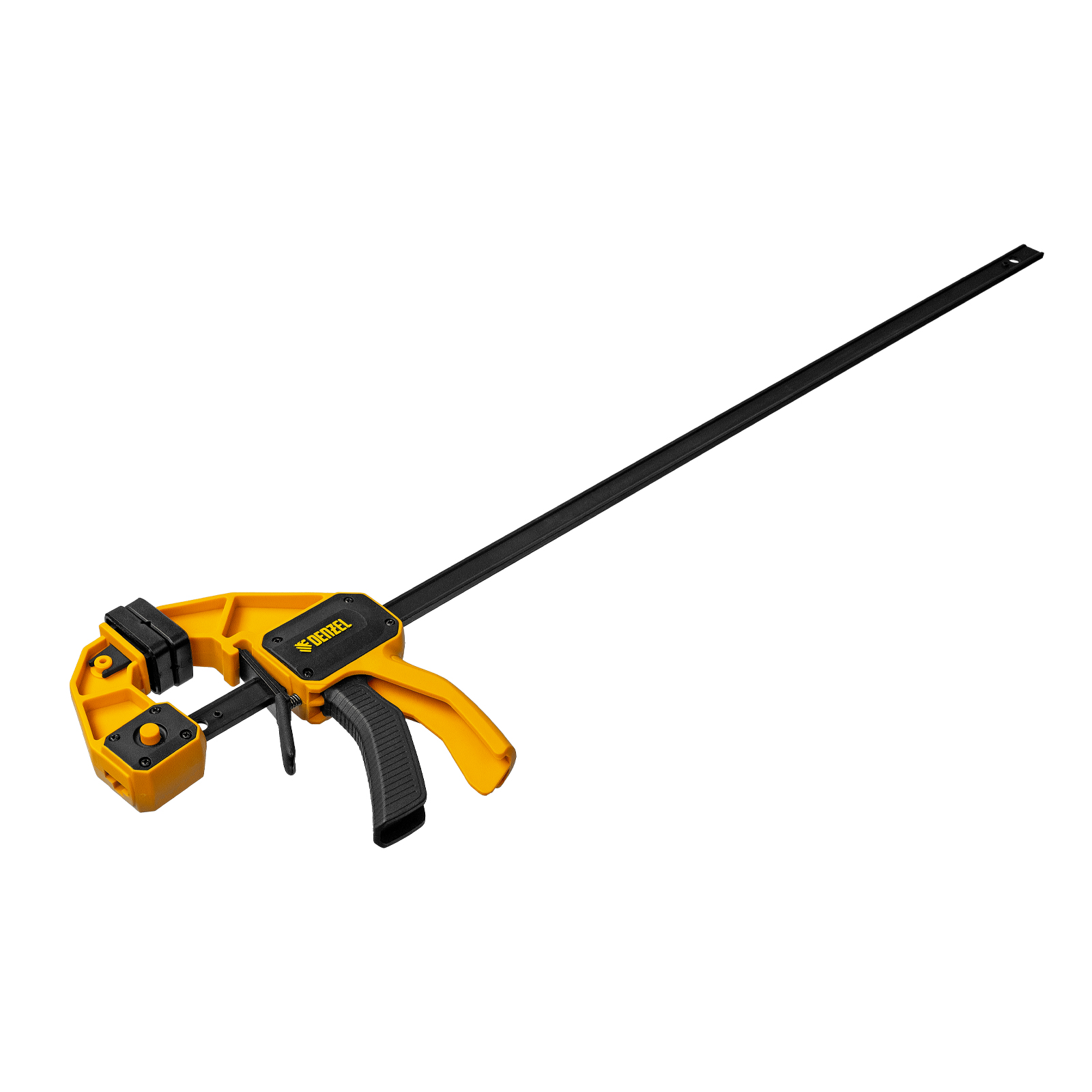 Струбцина f-образная, быстрозажимная, 600 х 80 мм, усиленный нейлоновый корпус denzel. Бренд: DENZEL Зажим: пошаговый Материал корпуса: нейлон Страна производства: Китай Глубина зажима, мм: 80 Усилие сжатие, Н: 1300 Ширина зажима, мм: 600 Тип упаковки: картонная подвесная карта Длина в упаковке, мм: 790 Ширина в упаковке, мм: 230 Вес (брутто), кг: 0.764 Струбцина: 1 шт Струбцина F-образная быстрозажимная Denzel 20508 с пошаговым зажимом шириной 600 мм и глубиной 80 мм, с усиленным нейлоновым корпусом, позволяет прочно зафиксировать детали для их обработки, склеивания и выполнения других задач. Сила сжатия составляет 1300 Н. Струбцина подходит для бытового и профессионального применения. Преимущества Усиленная конструкция — нейлоновый корпус устойчив к ударным нагрузкам и падениям с небольшой высоты. Увеличенная жесткость и прочность — направляющая выполнена из двутаврового стального профиля и закалена. Универсальное применение — плавающая губка обеспечивает уверенное сцепление с любой поверхностью. Аккуратная работа с любыми материалами — съемные мягкие губки позволяют зафиксировать деталь без риска повреждения и деформации. Расширенный функционал — переставные губки позволяют использовать струбцину на разжим. Комфортное использование — струбцина весит всего 764 г, обрезиненная кнопка фиксации обеспечивает удобный захват.  развернуть описание ▼
