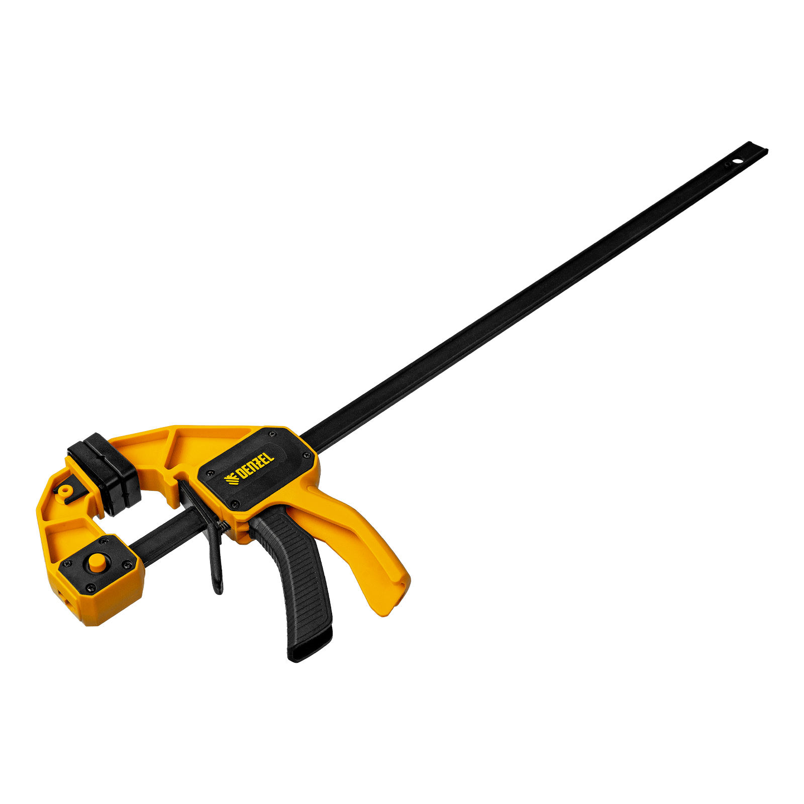 2шт струбцина f-образная, быстрозажимная, 450 х 80 мм, усиленный нейлоновый корпус denzel. Бренд: DENZEL Зажим: пошаговый Материал корпуса: нейлон Страна производства: Китай Глубина зажима, мм: 80 Усилие сжатие, Н: 1300 Ширина зажима, мм: 150 Тип упаковки: картонная подвесная карта Длина в упаковке, мм: 640 Ширина в упаковке, мм: 230 Вес (брутто), кг: 0.71 Струбцина: 1 шт Струбцина F-образная быстрозажимная Denzel 20507 с пошаговым зажимом шириной 450 мм и глубиной 80 мм, с усиленным нейлоновым корпусом, позволяет прочно зафиксировать детали для их обработки, склеивания и выполнения других задач. Сила сжатия составляет 1300 Н. Струбцина подходит для бытового и профессионального применения. Преимущества Усиленная конструкция — нейлоновый корпус устойчив к ударным нагрузкам и падениям с небольшой высоты. Увеличенная жесткость и прочность — направляющая выполнена из двутаврового стального профиля и закалена. Универсальное применение — плавающая губка обеспечивает уверенное сцепление с любой поверхностью. Аккуратная работа с любыми материалами — съемные мягкие губки позволяют зафиксировать деталь без риска повреждения и деформации. Расширенный функционал — переставные губки позволяют использовать струбцину на разжим. Комфортное использование — струбцина весит всего 710 г, обрезиненная кнопка фиксации обеспечивает удобный захват.  развернуть описание ▼