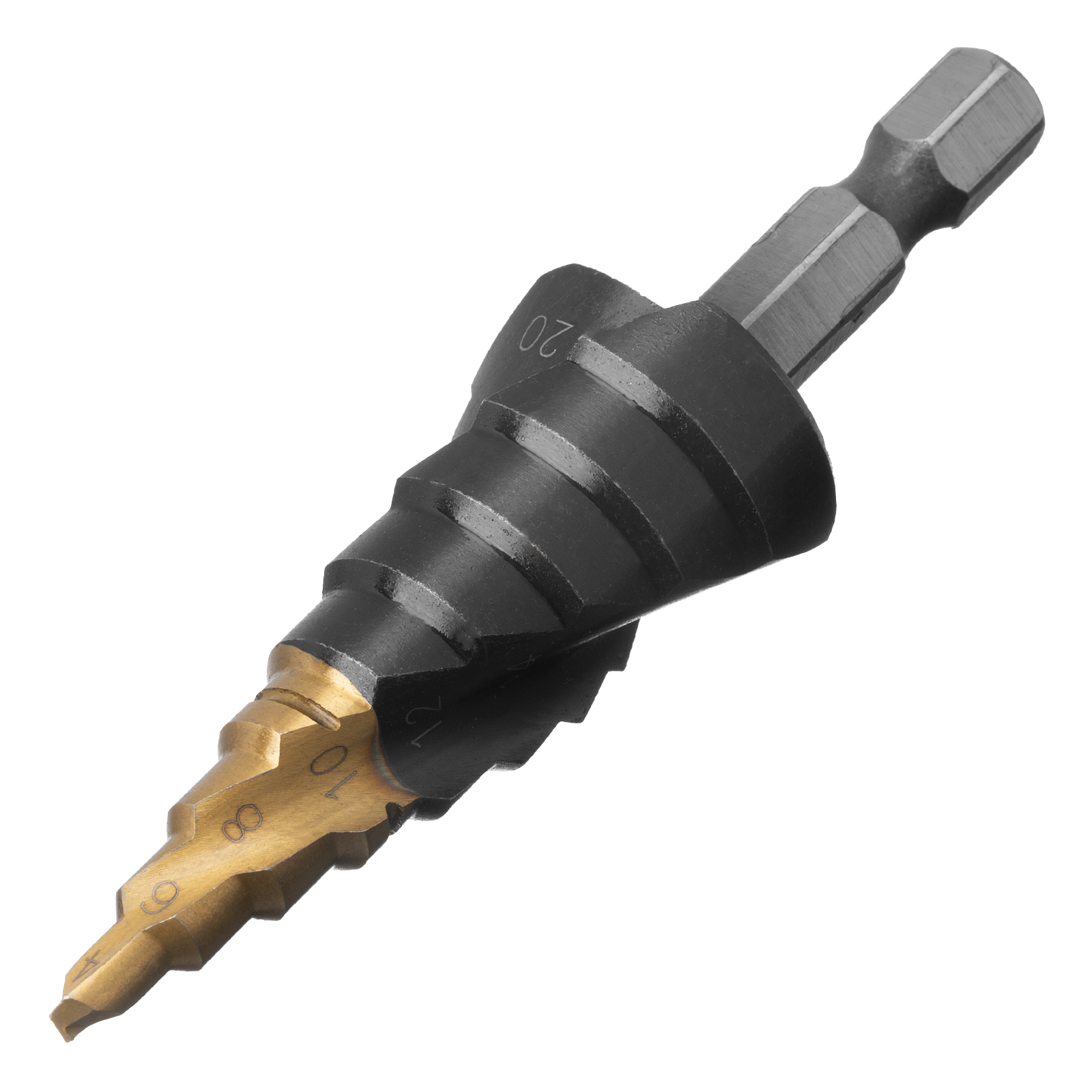 2шт сверло ступенчатое 4-6-8-10-12-14-16-18-20 мм, р6м5, 6-гр. хвостовик denzel. Бренд: DENZEL Класс точности: А1 Материал обработки: металл, пластик Тип хвостовика: шестигранный Страна производства: Китай Диаметр хвостовика, мм: 7.1 Тип упаковки: блистер Длина в упаковке, мм: 160 Ширина в упаковке, мм: 70 Вес (брутто), кг: 0.07 Сверло ступенчатое: 1 шт Ступенчатое сверло Denzel 723603 из стали P6M5, с 6-гранным хвостовиком, предназначено для сверления отверстий диаметром от 4 до 20 мм в сталях, цветных металлах и пластике. Избавляет от необходимости иметь при себе целый набор традиционных сверл. Позволяет получать отверстия с ровными краями и уже снятой фаской под гайку или болт. Оснастке присвоен класс точности A1. Сверло пригодится дома и в мастерской. Преимущества Эффективность — оснастка из прочной быстрорежущей стали P6M5 устойчива к интенсивным динамическим нагрузкам. Высокий ресурс — рабочие части твердостью 62-64 HRC долго сохраняют режущие свойства. Долговечность — нитридтитановое покрытие повышает стойкость к перегреву и предотвращает образование коррозии, также сверло покрыто техническим маслом для дополнительной защиты от разрушения. Быстрое начало работы — заточка Split point позволяет приступать к сверлению сразу, без предварительной разметки поверхности (накернивания) и засверливания. Надежная фиксация — шестигранный хвостовик не проворачивается в патроне дрели. Удобная упаковка — внутри блистера находится пластиковый кейс, обеспечивающий удобное хранение сверла.  развернуть описание ▼