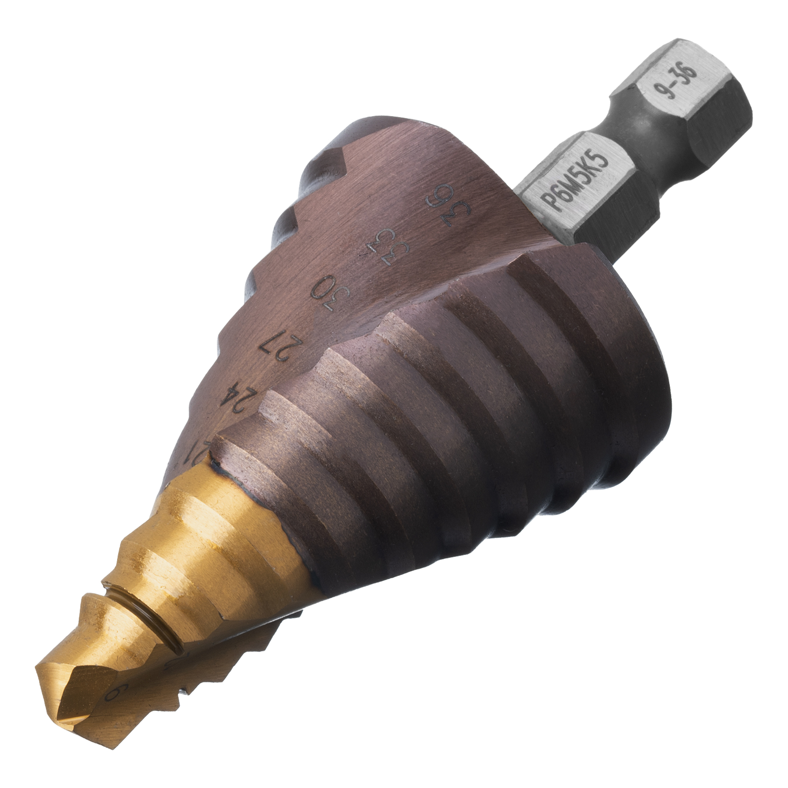 2шт сверло ступенчатое, 9-12-15-18-21-24-27-30-33-36 мм, р6м5к5, 6-гр. хвостовик Denzel