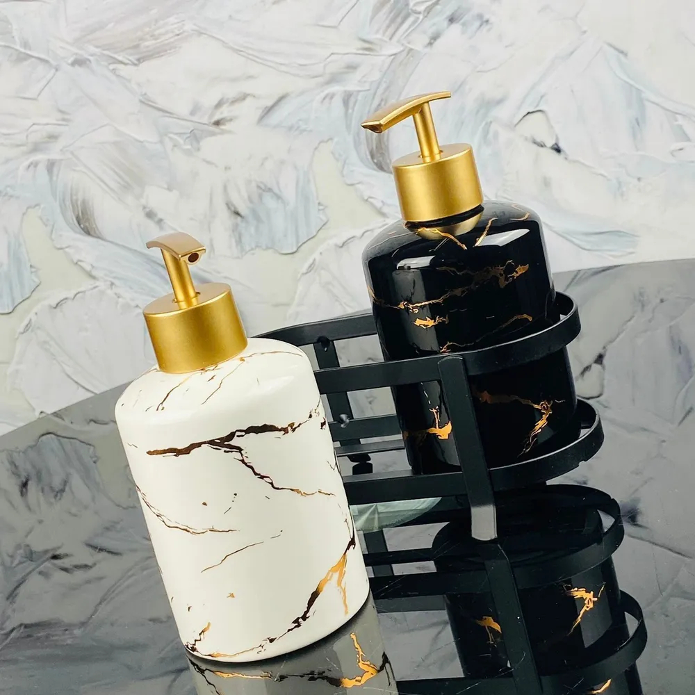 Дозаторы для жидкого мыла выполнены из фарфора с белой и черной матовой однотонной эмалью.