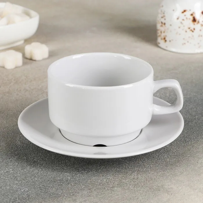 4шт чайная пара белая, 250 мл, штабелируемая. Посуда из фарфора Белая лишена каких-либо декоративных элементов. Единственным украшением лаконичного изделия служит ее элегантная форма. Подобные модели будут выгодно смотреться как в ходе большого торжества, так и за семейным обедом! Дополнительно: Поверхность может иметь сероватый оттенок. Объём измеряется от дна до верхнего края изделия и может отличаться до 10% от заявленной величины в связи с особенностями производства.  развернуть описание ▼