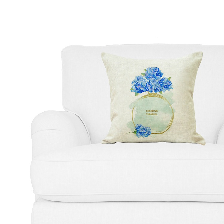 Декоративная подушка, голубой флакон в акварели, льняная наволочка, бежева