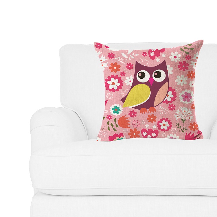 Декоративная подушка, сова в цветах, льняная наволочка, розовая, 45х45 см