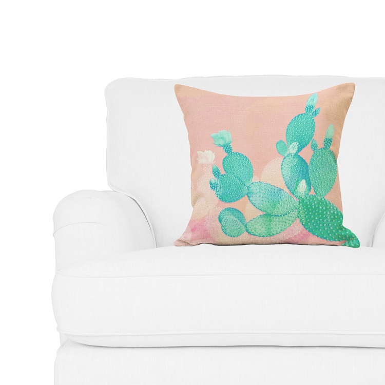 Декоративная подушка, кактус, льняная наволочка, розовая, 45х45 см