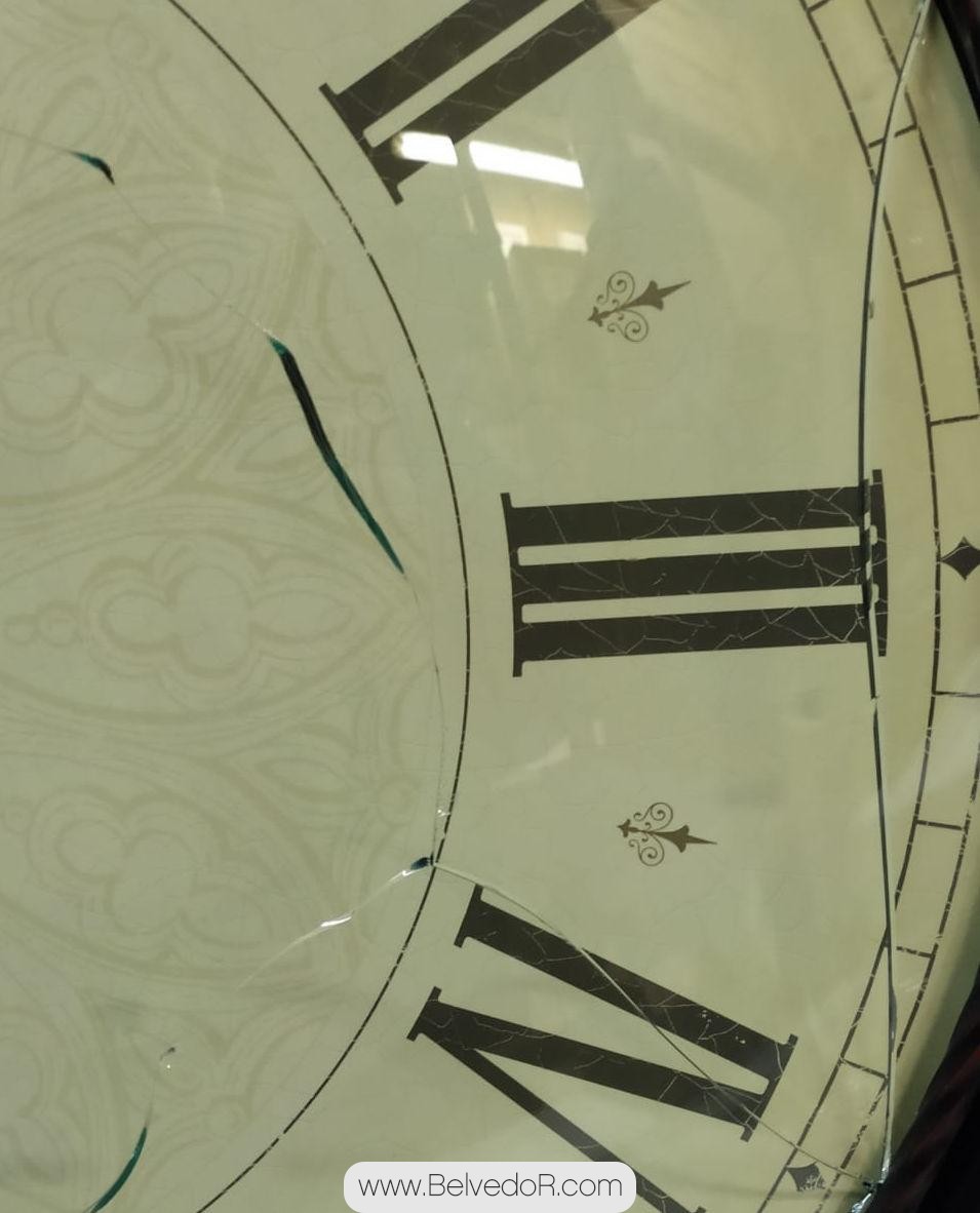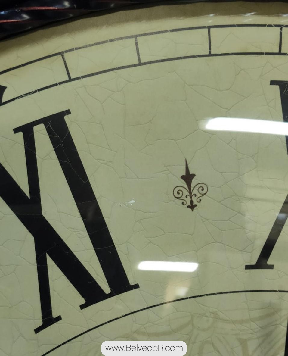 Центр искусственно состаренного циферблата украшает изысканный декоративный узор, искусственно состаренные римские цифры черного цвета, черные пикообразные часовая и минутная стрелки, выпуклое хрустальное стекло.