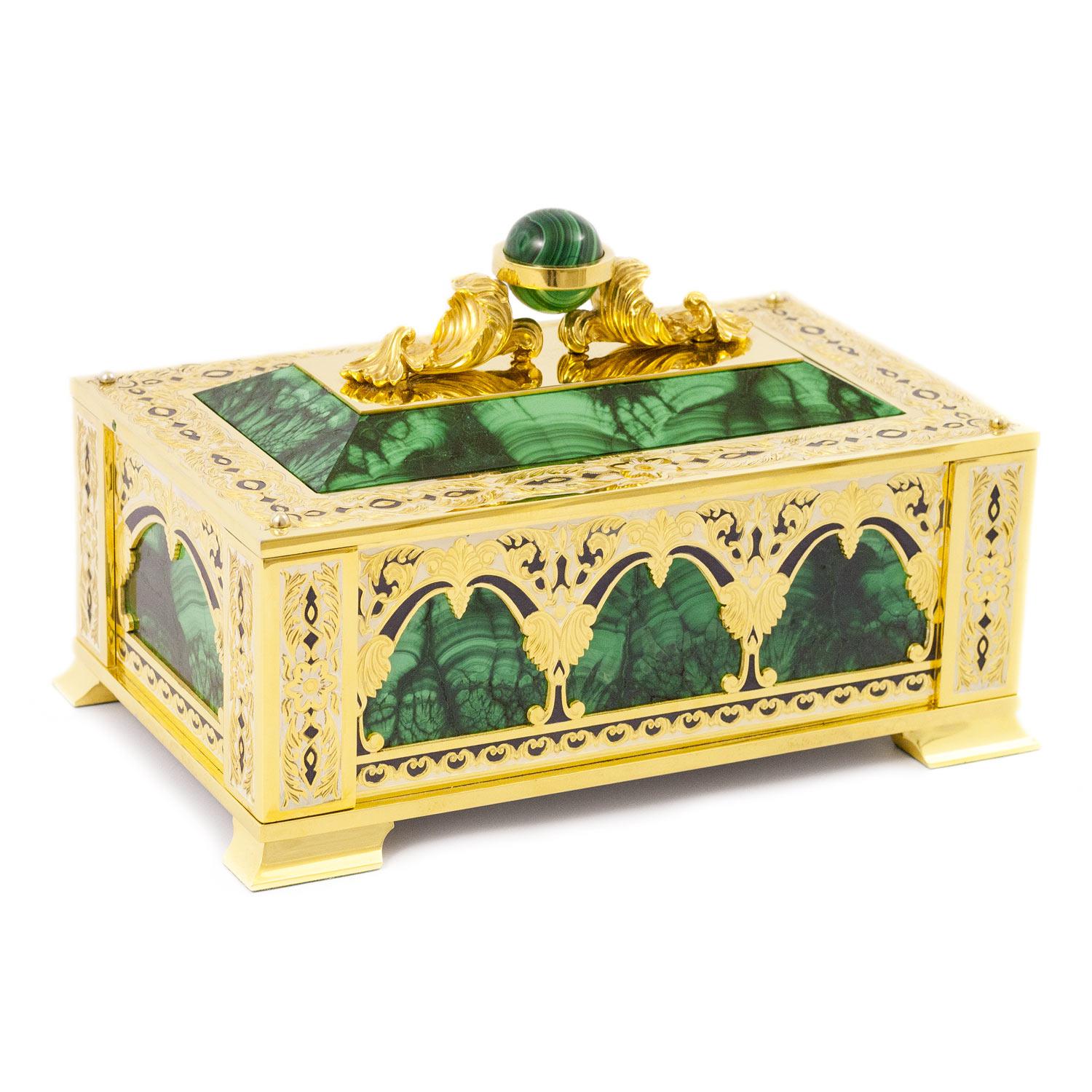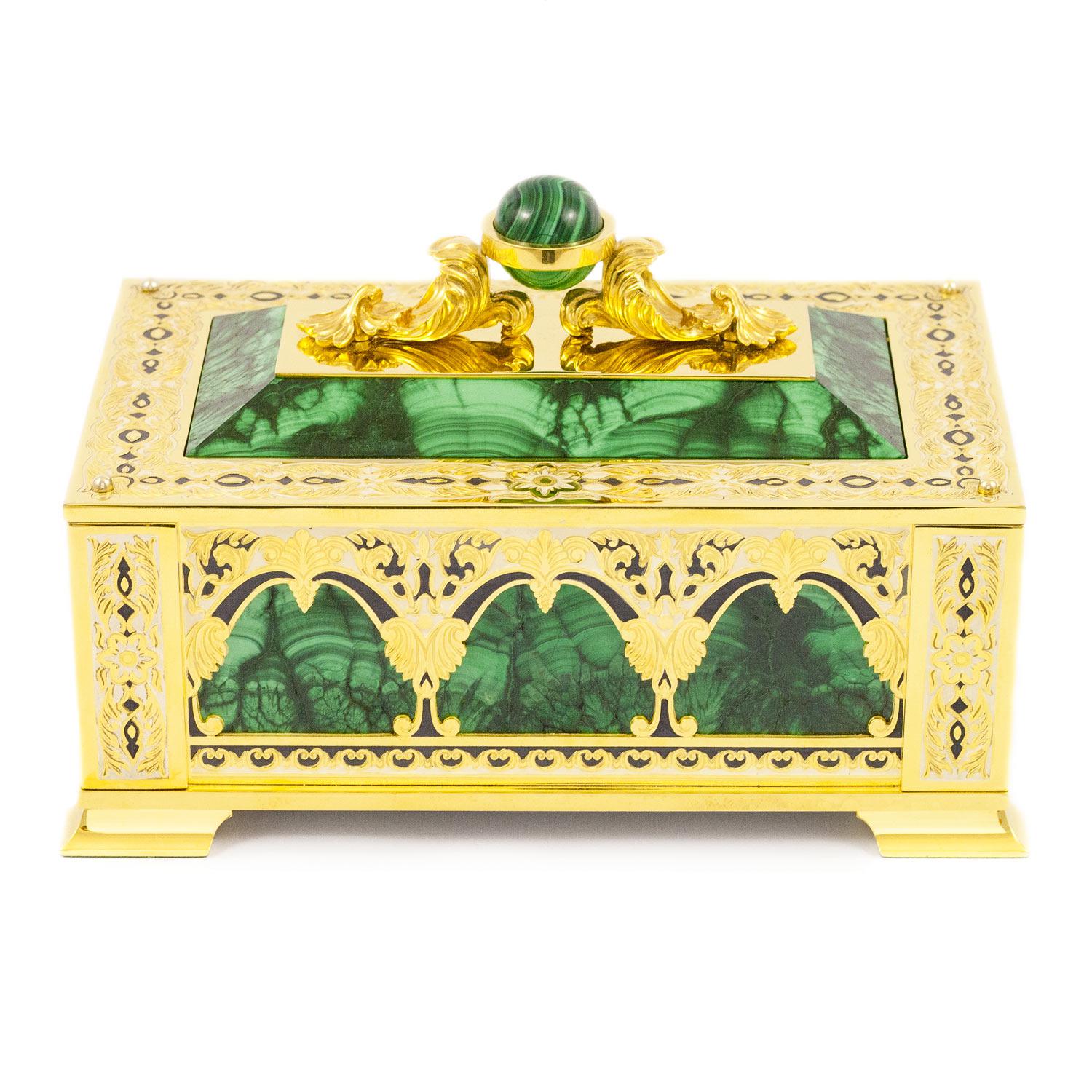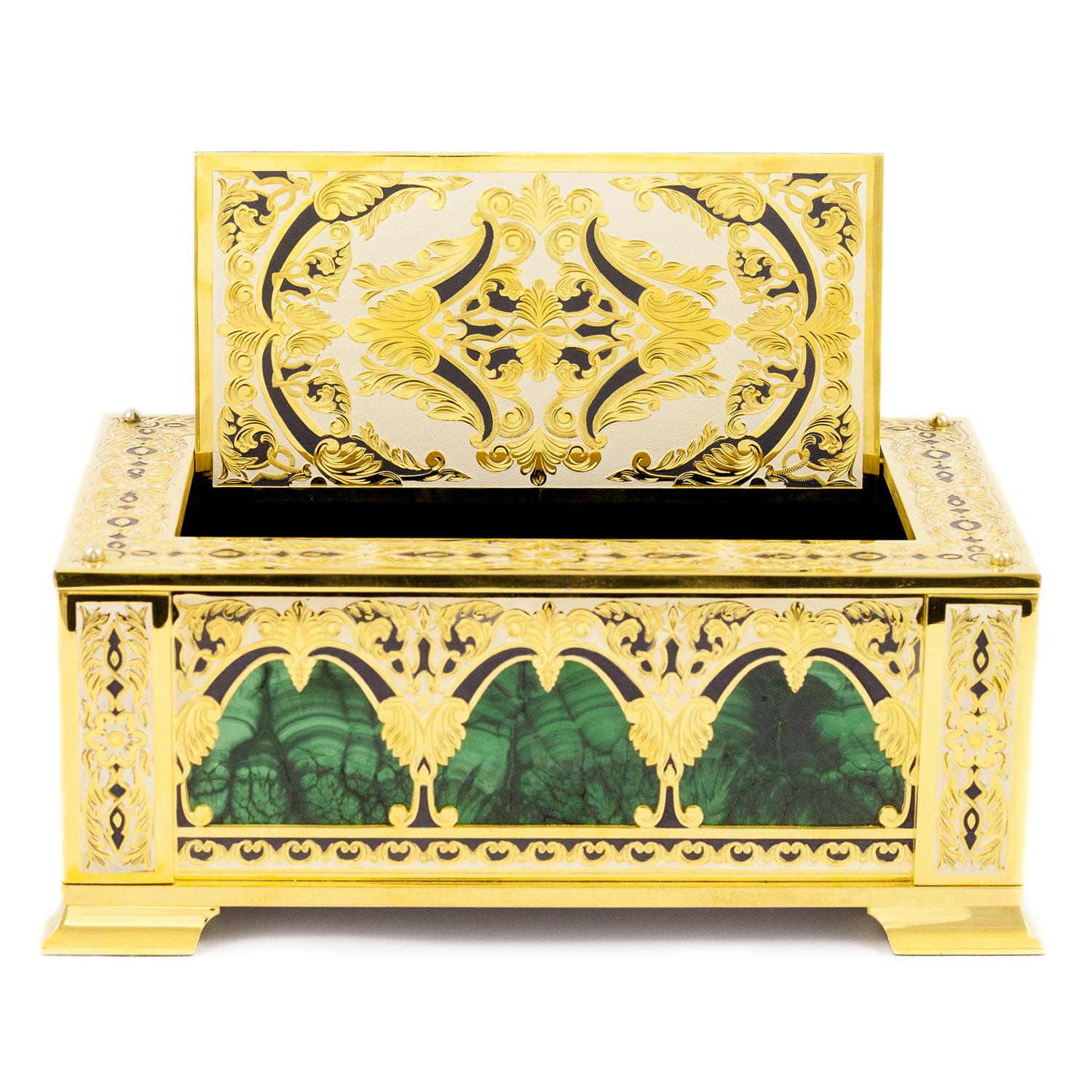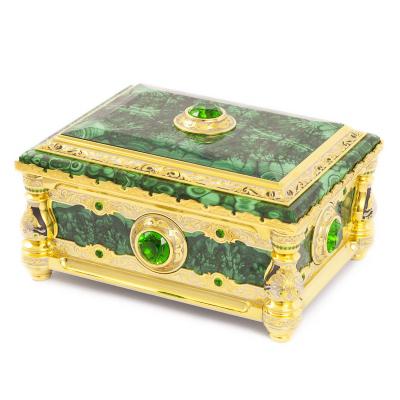Ларец "малахитовый". Вес 5000 г Размер 22,5х14,5х14 Материал малахит, бронза, латунь, никель, покрытие золотом (999,9).  развернуть описание ▼