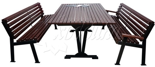 Столешница, сиденье и спинка: Брус из хвойных пород древесины - сосна/ель (варианты исполнения: лиственница, композитные материалы) различного сечения. Огнебиозащитные пропитки + тонировочный состав с антисептиком + два слоя яхтного лака с промежуточным шлифованием. Возможность выбора цвета из палитры.