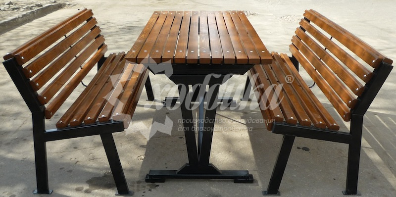 Столешница, сиденье и спинка: Брус из хвойных пород древесины - сосна/ель (варианты исполнения: лиственница, композитные материалы) различного сечения. Огнебиозащитные пропитки + тонировочный состав с антисептиком + два слоя яхтного лака с промежуточным шлифованием. Возможность выбора цвета из палитры.