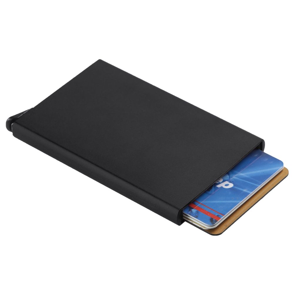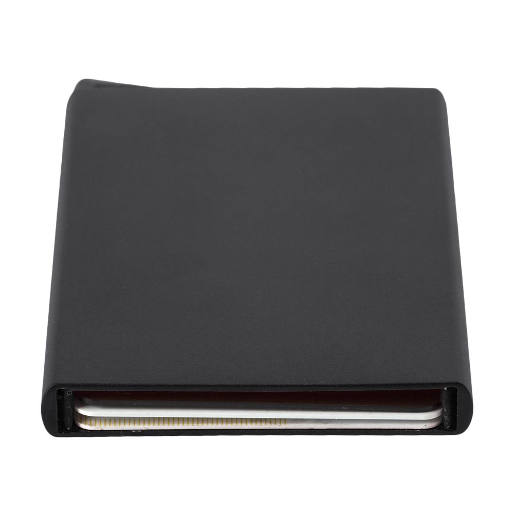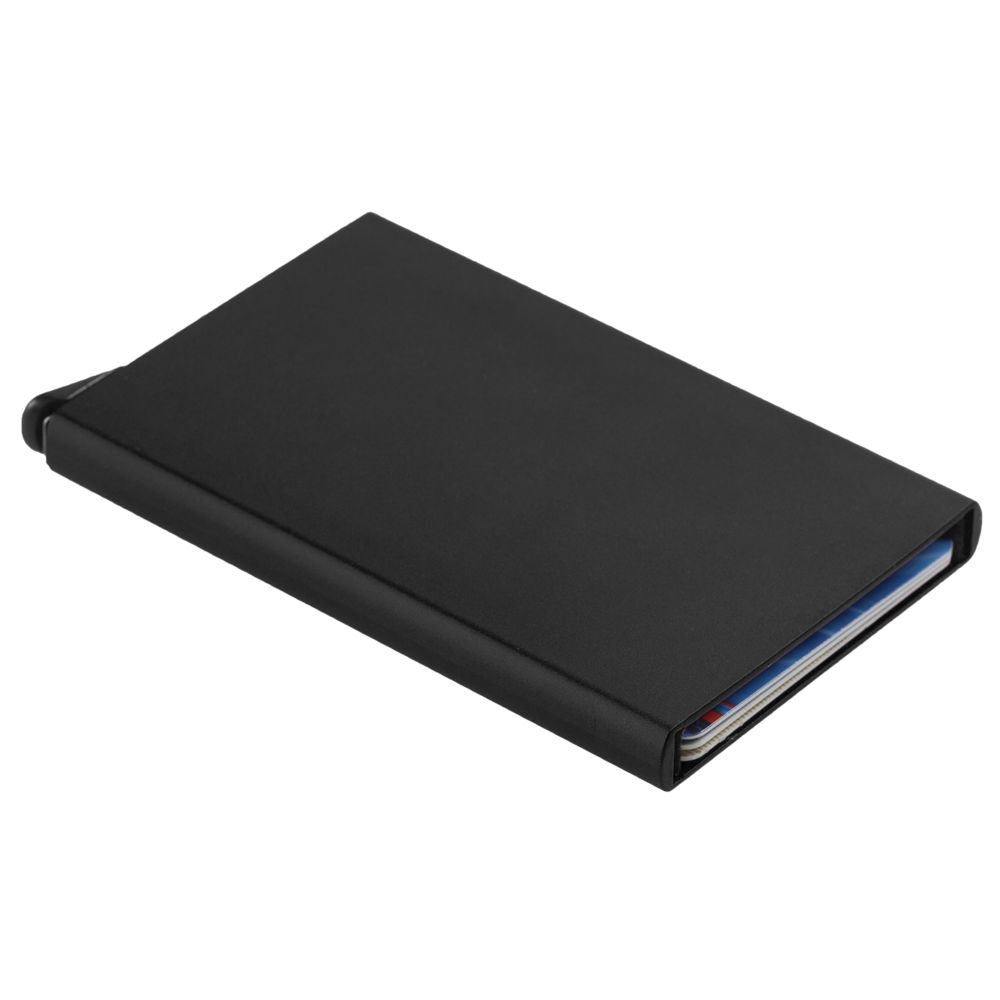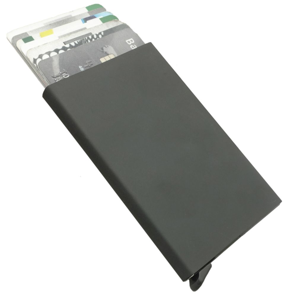Футляр для пластиковых карт motion, черный. Размеры 6,2x9,5x0,8 см; упаковка: 6,5х10,5х1 см Материал алюминий Вес (1 шт.) 60,00 г Транспортная упаковка 29,0x35,0x46,0 см Вес 12,00 кг Объем упаковки 0,047 м? Количество в упаковке 200 шт. Виды нанесения A2-Тампопечать LM3-Лазерная гравировка по металлу UV-УФ-печать Футляр с выдвижным механизмом имеет защиту RFID. Вмещает 6 карточек.