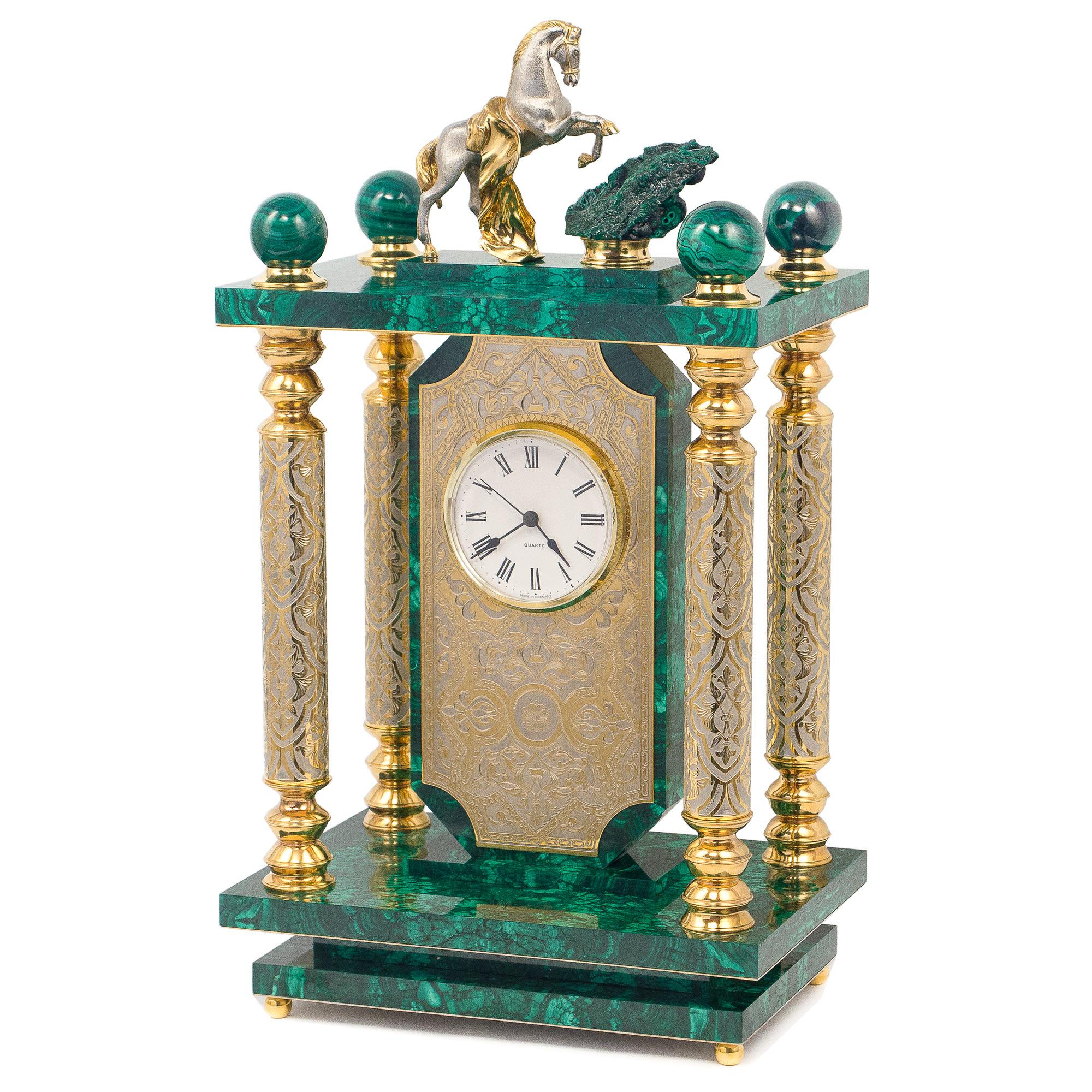 Часы "конь с попоной" малахит. Вес 30000 г Размер 30х20х53 см Материал малахит, бронза, латунь, никель, покрытие золотом (999,9).  развернуть описание ▼