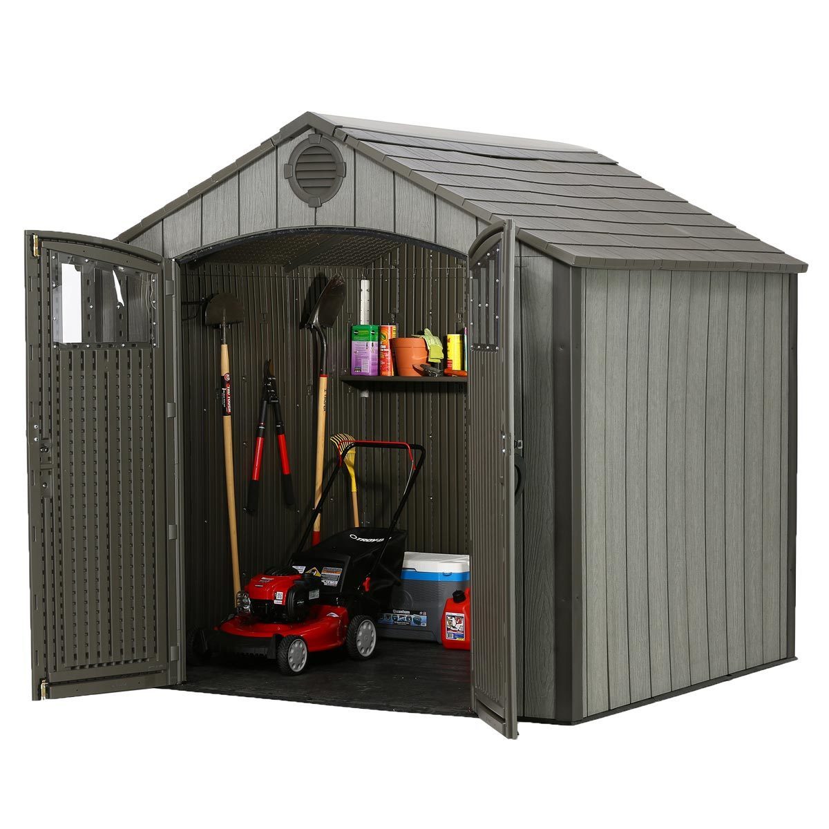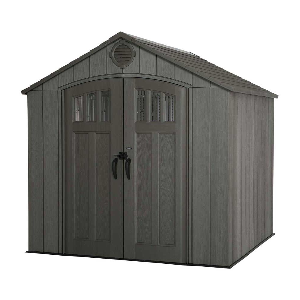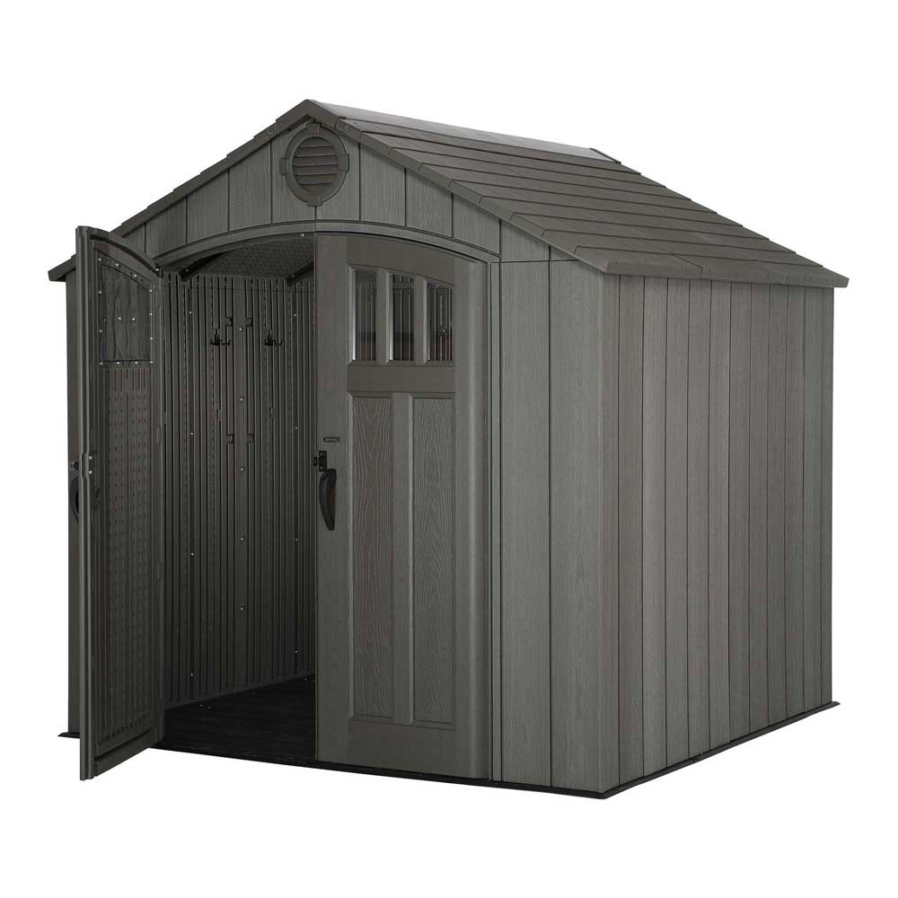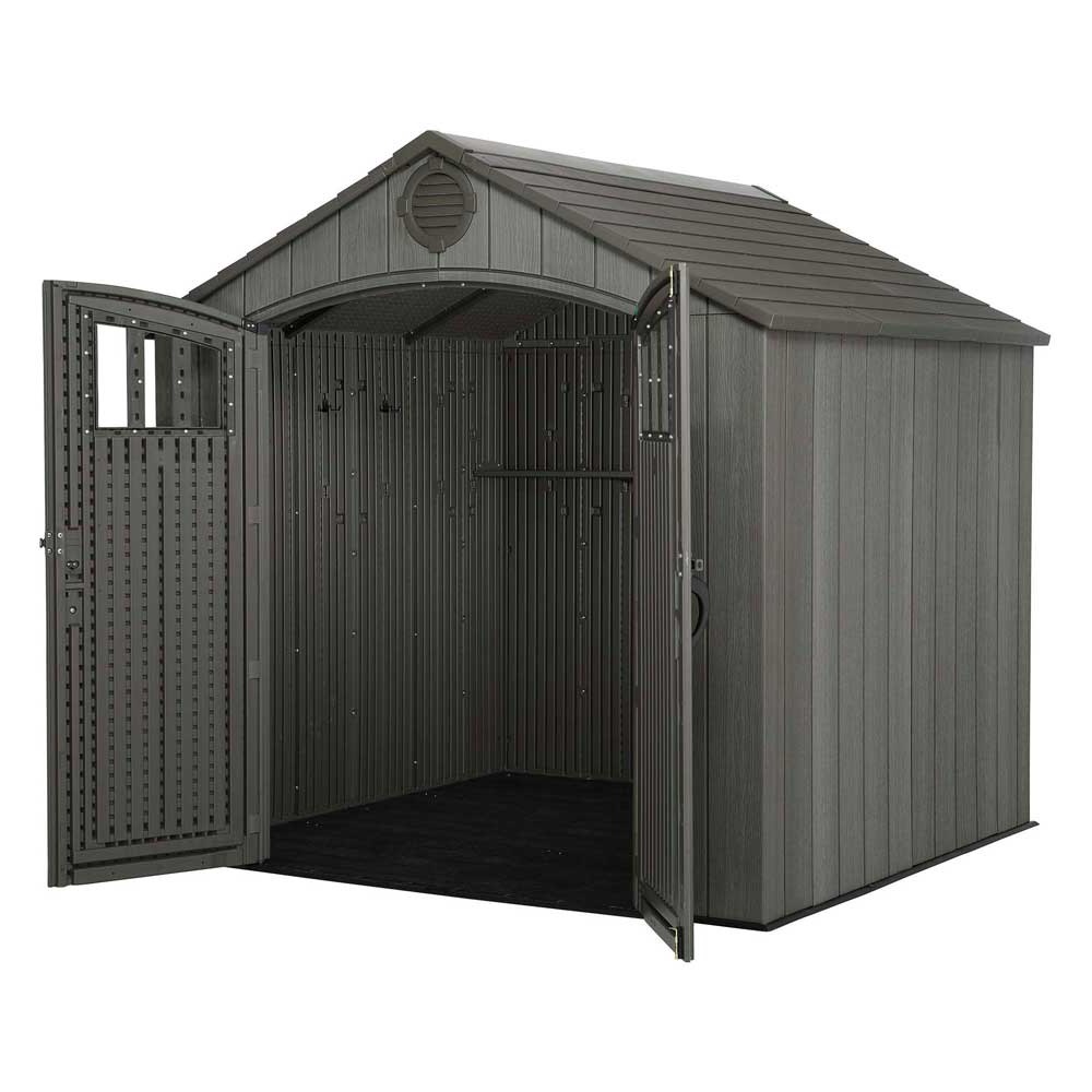 Пластиковый сарай lifetime woodlook 8x7.5, уличное оборудование. Пластиковый сарай Solid House WoodLook с отделкой под фактуру дерева. В комплект каждого сарая входит: система пассивного проветривания, пластиковый пол, усиленный металлический каркас, армированные стены, двери и кровля, окна, двери с петлями, прозрачный конек, полка 2,25м, 6 крючков, усилитель кровли, небьющиеся стекла в дверях. Выдерживает нагрузку на крышу-стены до 175 кг. Внешний размер по основанию, см 238 X 223 X 243 (в) Внутренний размер, см 228 Х 213 Х 238 (в) Размер дверного проема, см 142 Х 193 Площадь, м2 4,9 Срок службы до 30 лет