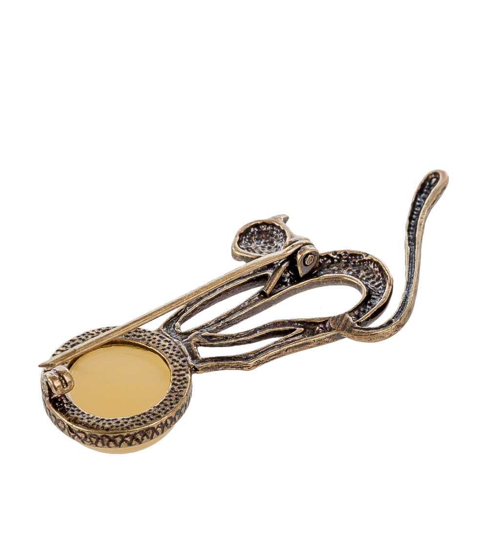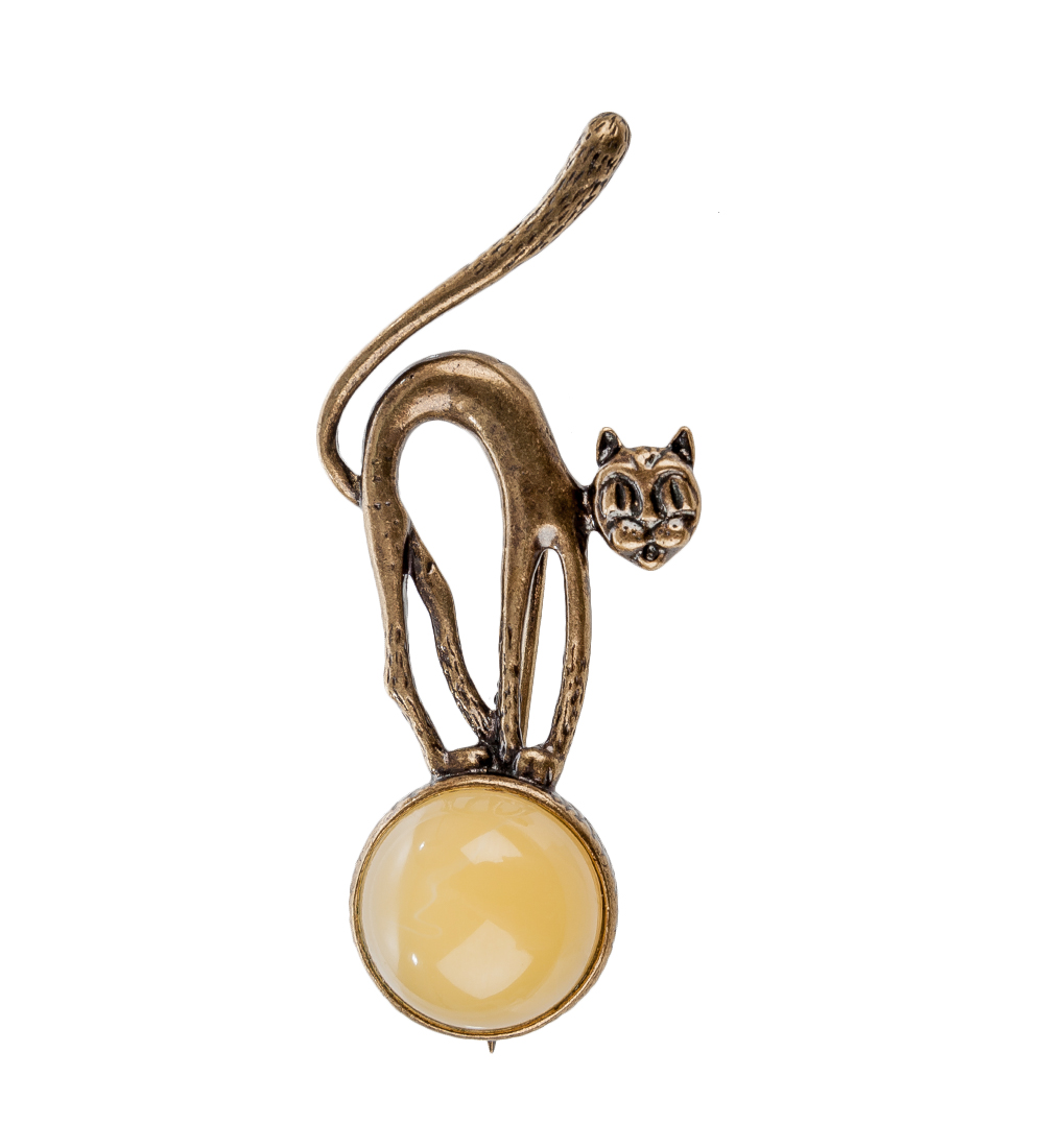 Am-183 фигурка-брошь кошка на шаре (латунь, янтарь)