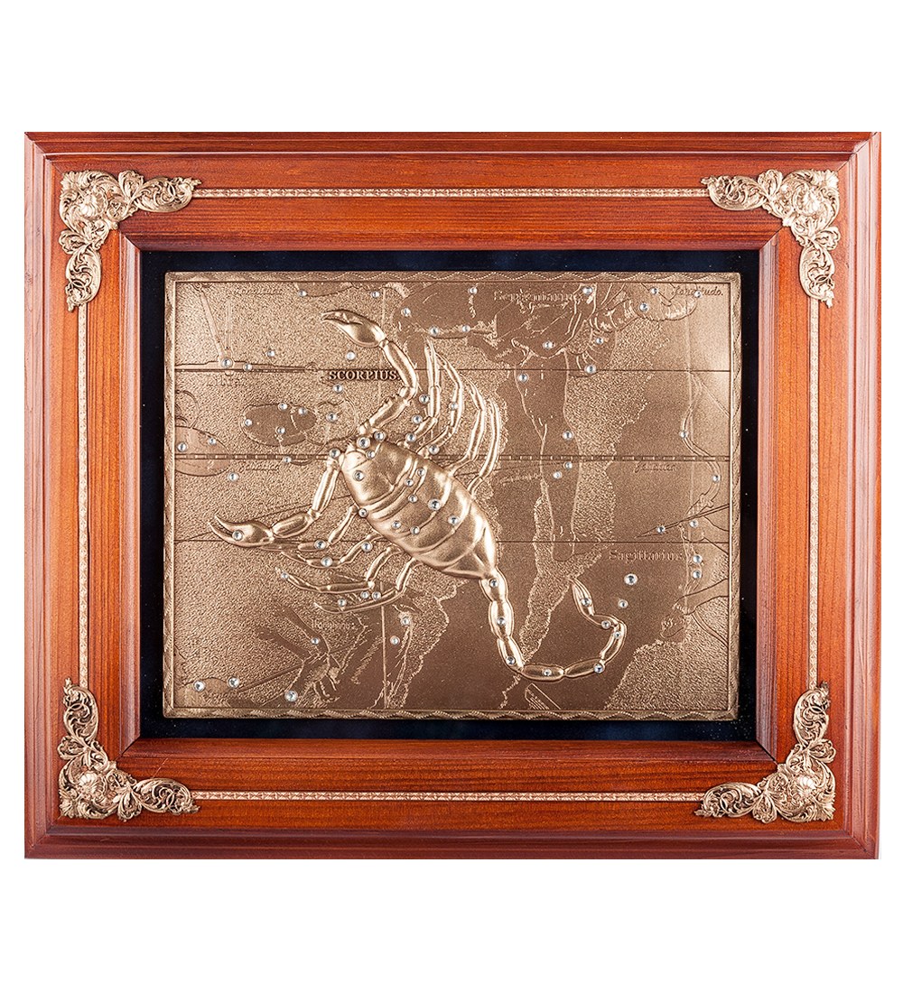 Ключница знак зодиака скорпион. Материал: Медь, дерево, кристалы сваровски, бархат Страна производства: Россия Страна бренда: Россия Размеры изделия: Ширина: 33 см Высота: 29 см Толщина: 9 см Вес: 2.3 кг. Размеры упаковки: Длина: 35 см Ширина: 32 см Высота: 10 см Вес: 2.6 кг.  развернуть описание ▼