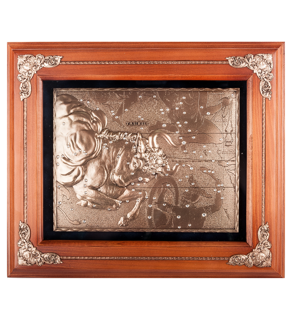Ключница знак зодиака телец. Материал: Медь, дерево, кристалы сваровски, бархат Страна производства: Россия Страна бренда: Россия Размеры изделия: Ширина: 33 см Высота: 29 см Толщина: 9 см Вес: 2.2 кг. Размеры упаковки: Длина: 35 см Ширина: 32 см Высота: 10 см Вес: 2.5 кг.  развернуть описание ▼