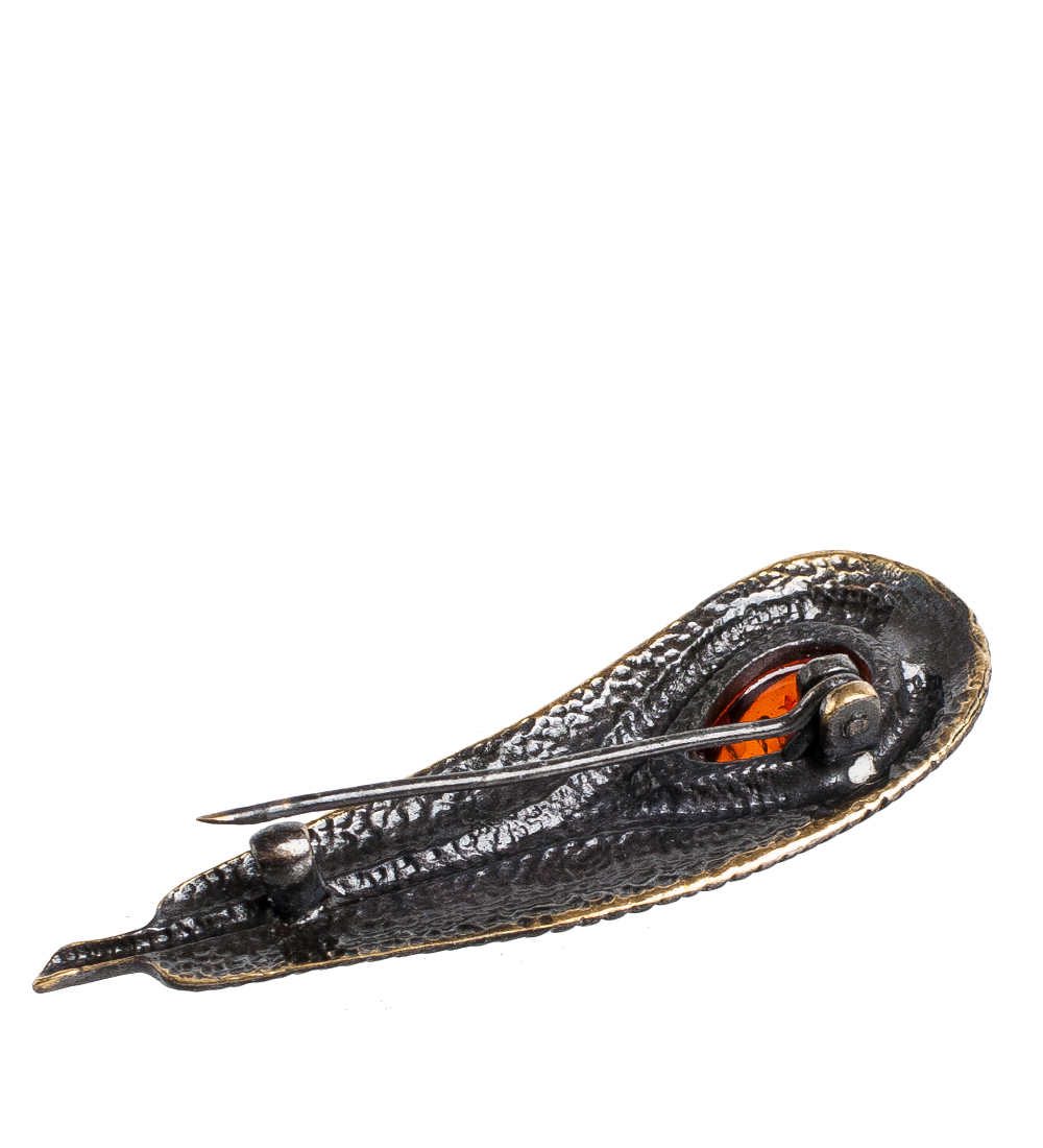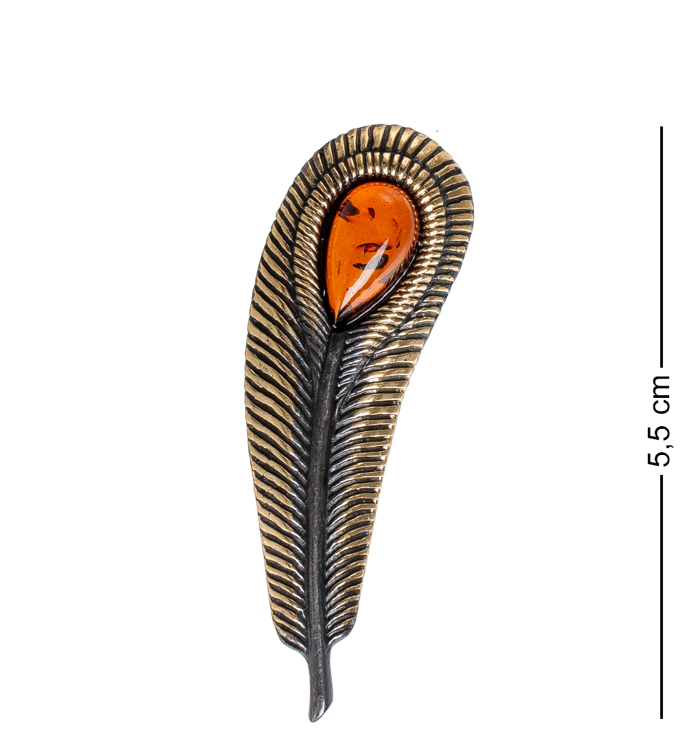 Am- 938 брошь перо павлина (латунь, янтарь)