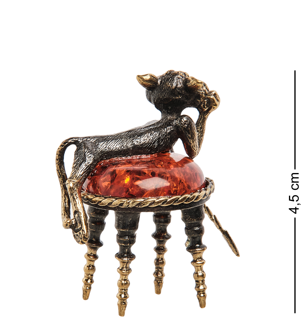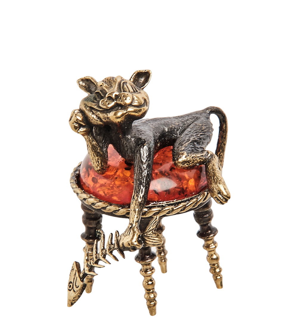 Am-1043 фигурка кот сытый на пуфике (латунь, янтарь)