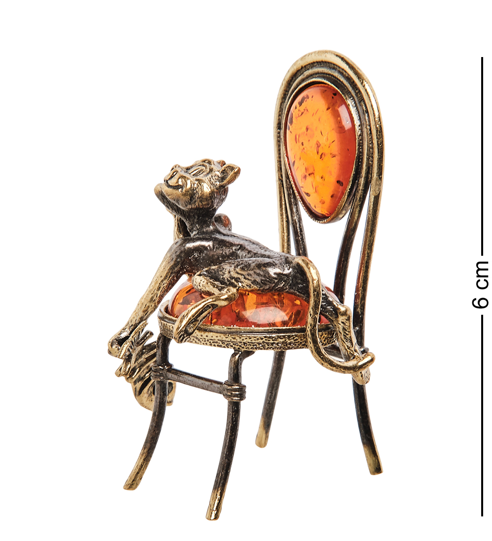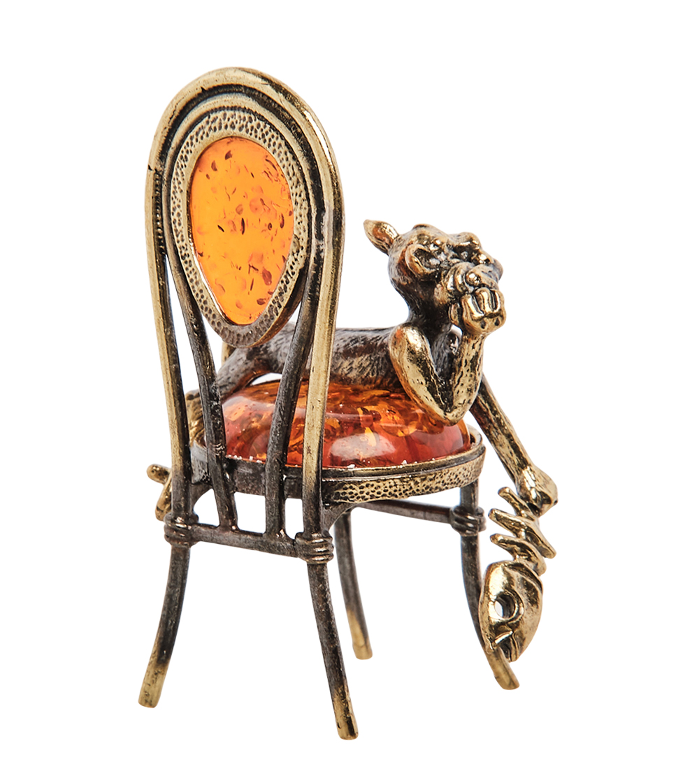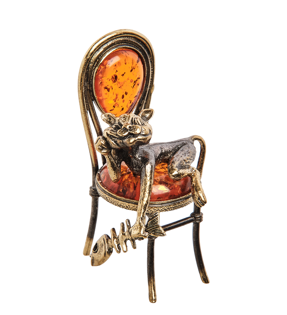 Am-1044 фигурка кот сытый на стуле (латунь, янтарь)