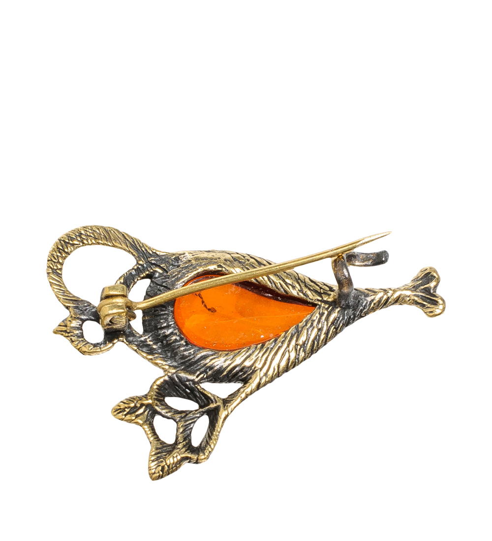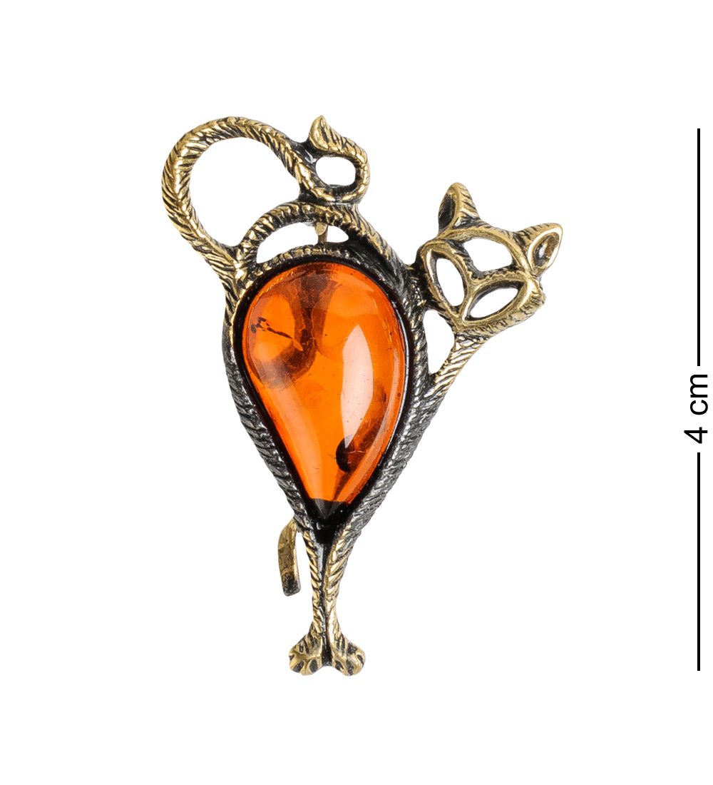 Am-1637 брошь кошка капля (латунь, янтарь)