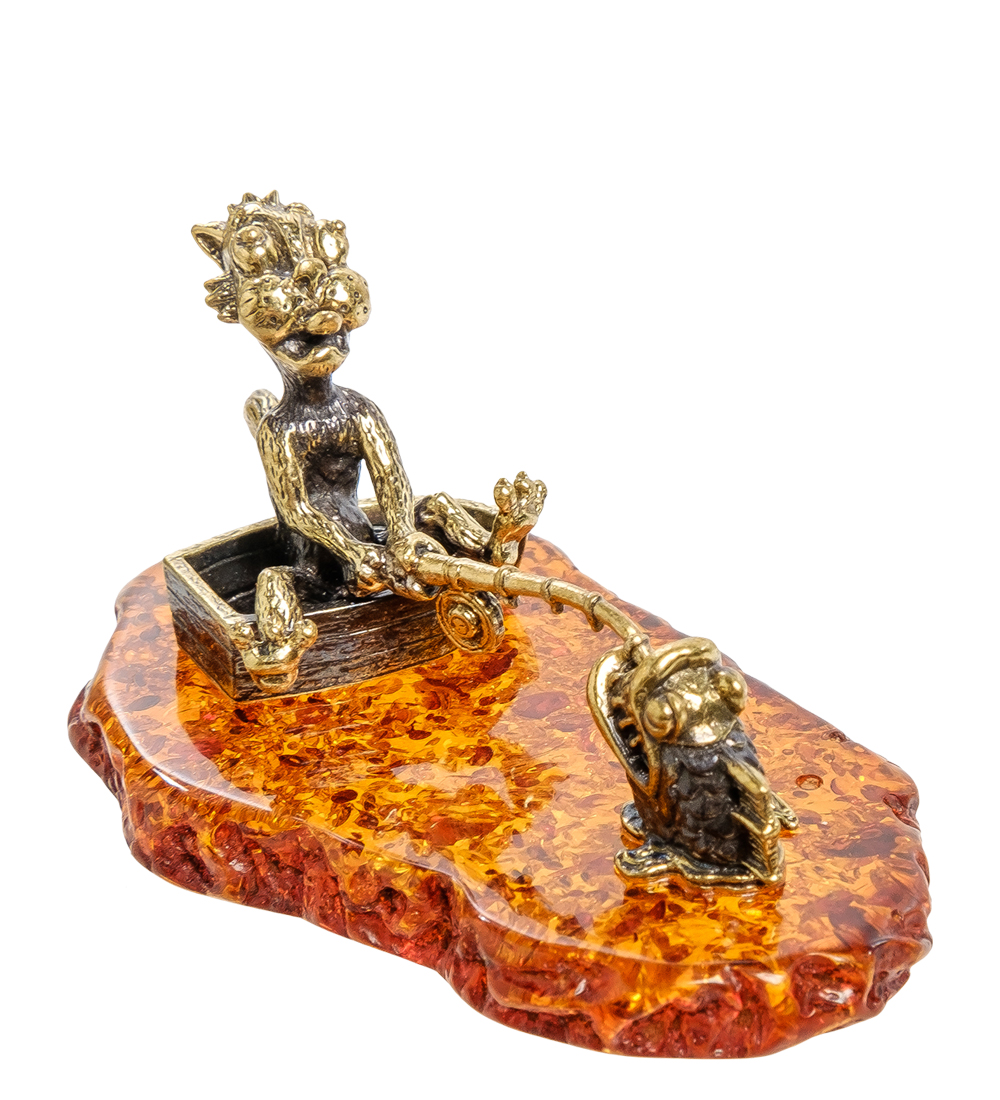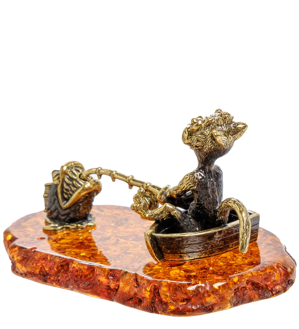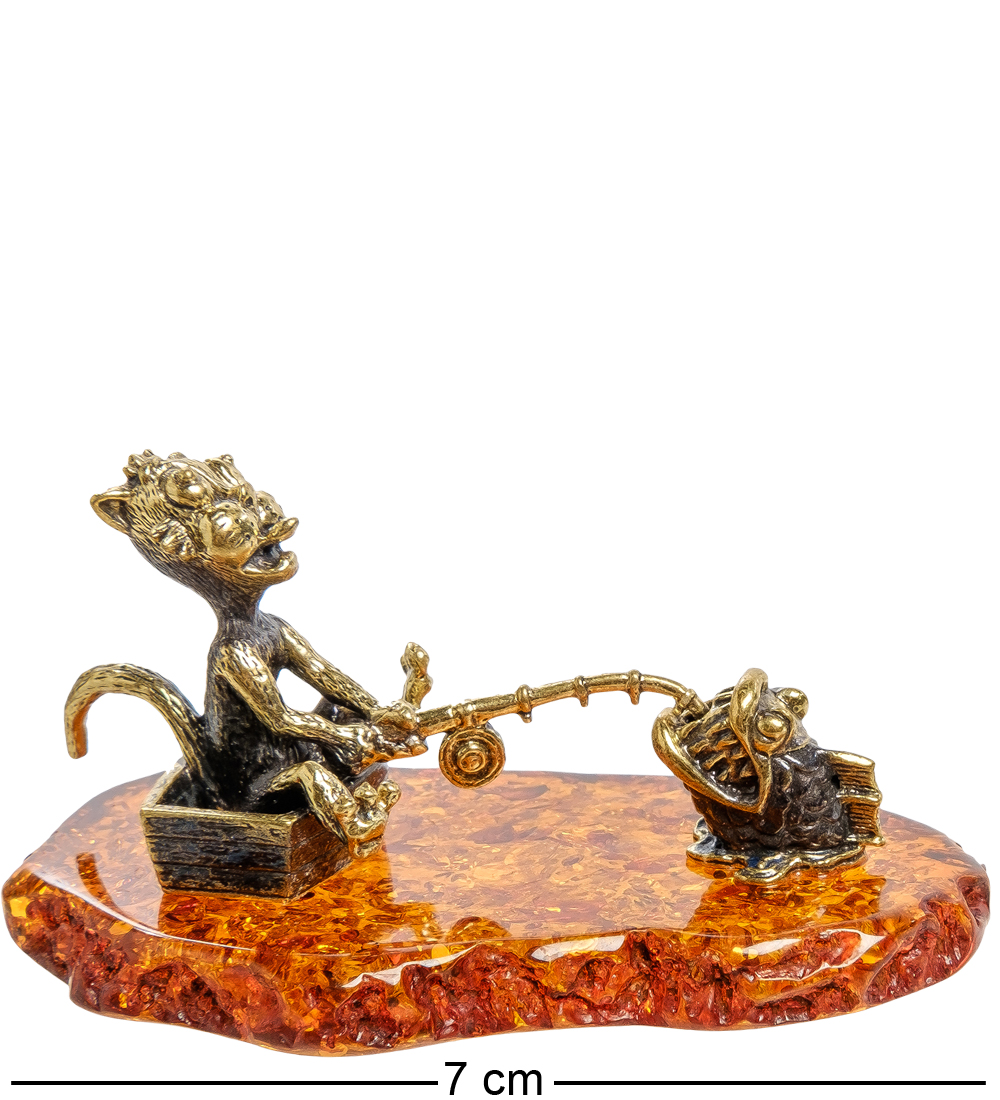 Am-2046 фигурка кот рыбак с пираньей (латунь, янтарь)