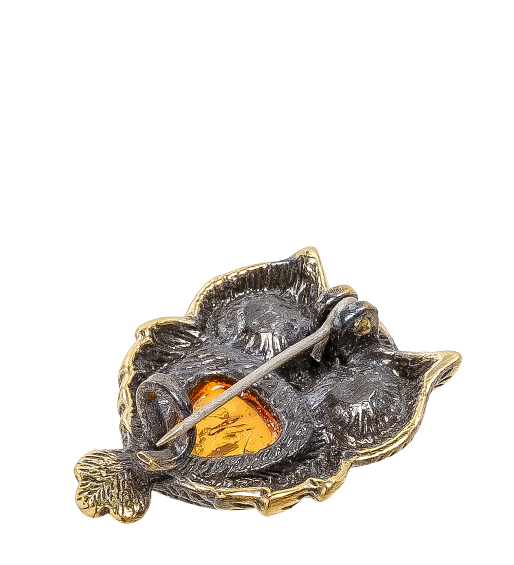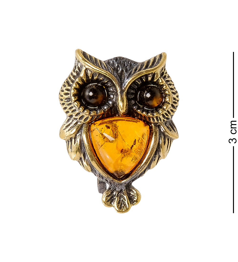 Am-2110 брошь сова пушистик (латунь, янтарь)